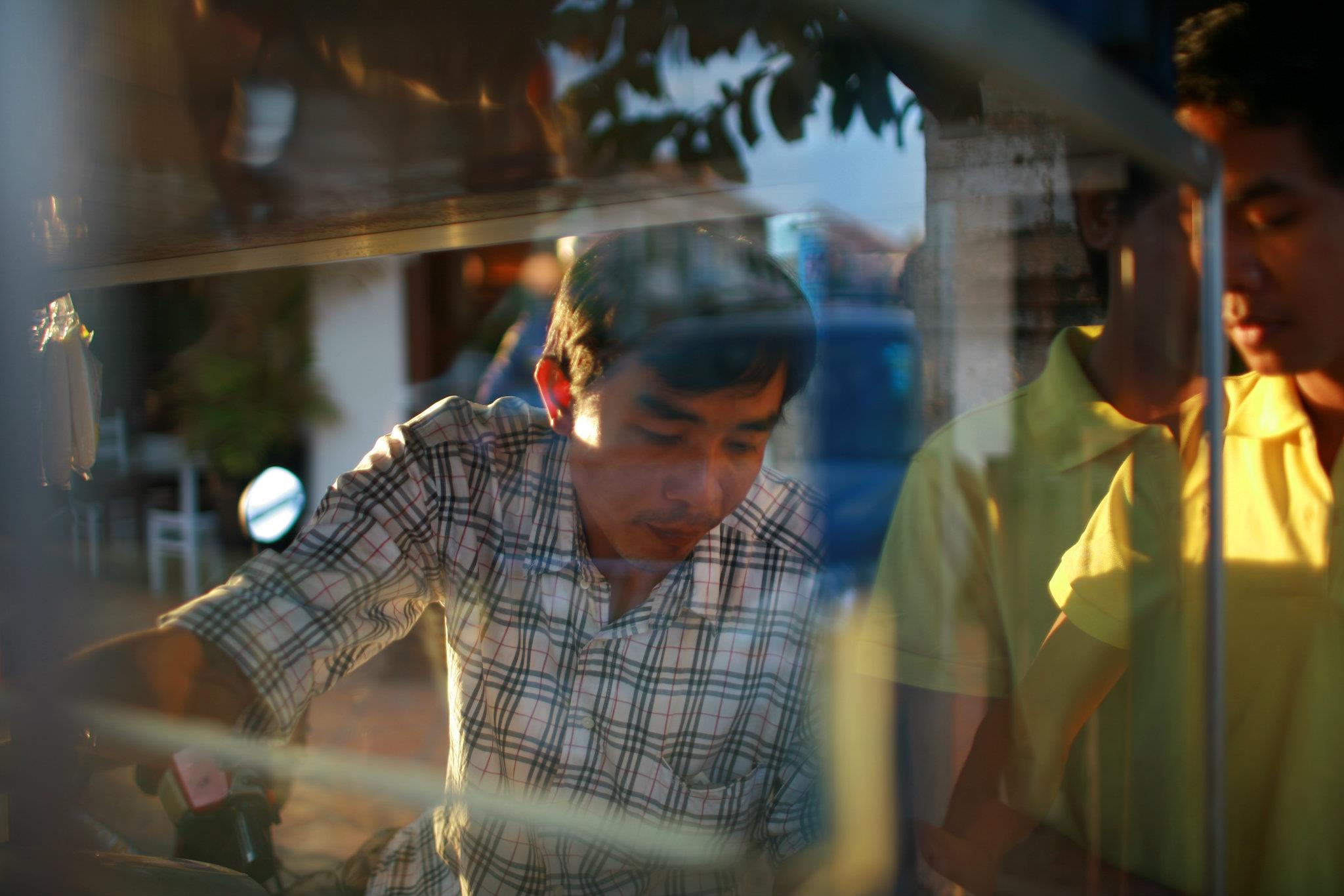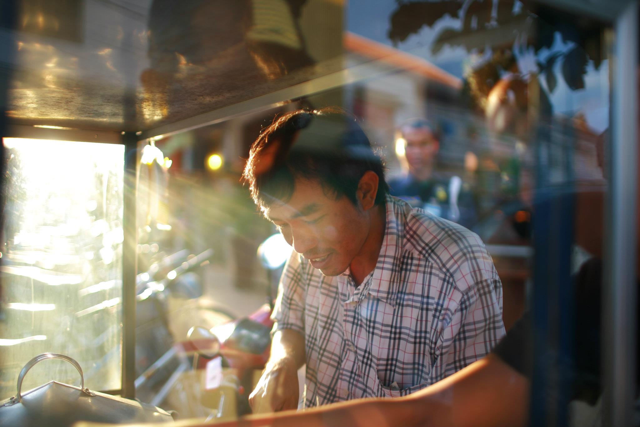 Sang Siem Reap được 2 năm cũng là hai năm anh lao vào cùng công việc. Do ở nhà làm ruộng quá khó khăn không đủ sống và kiếm tiền nuôi con nên anh quyết định bàn cùng vợ để sang đây buôn bán kiếm sống. Đứa con một tuổi đành để lại Trà VInh cho ông bà nội ngoại. Cả hai vợ chồng thuê một căn phòng be bé ở ngoại ô Siem Reap để ở và nấu nướng buôn bán. Ở một thành phố du lịch thì không có nghề gì lương thiện mà dễ kiếm bằng hàng ăn. Người có đất có vốn thì bán trong quán, trong nhà hàng, vợ chồng anh vốn cụt thì bán xe đẩy chạy vòng vòng quanh cái thành phố bé xíu. Chiếc xe của anh là một chiếc xe chế, nó là một gánh cháo lòng trên xe, nơi mà cùng nó anh chạy khắp nơi để giao hàng và để bán. Anh kể lúc mới đi bán thì ngày ngày hai vợ chồng phải dắt díu nhau dậy từ 3h sáng nấu cháo và lại dắt díu chở nhau ra chợ để bán. Và gần như cả tháng đầu tiên đều phải ôm nửa nồi cháo về nhà nhìn nhau. Nghĩ cũng đúng, lạ nước lạ cái, không quen biết ai, mưu sinh là chuyện không dễ dàng.