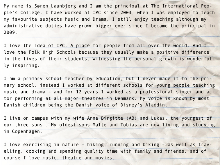 Thầy hiệu trưởng là một ca sỹ, một diễn viên tài danh. Thầy khá nổi tiếng ở Đan Mạch vì từng đại diện cho quốc gia này thi Eurovision, là nhân vật lồng tiếng cho các phim của Disney như Aladin, người đẹp và quái vật, Despicable me…Thầy hát rất hay, phải nó là rất hay, diễn xuất cũng rất hay, với tôi thầy là một thầy giáo tuyệt vời, một người làm giáo dục đầy cảm hứng. Đó cũng là lý do mà các lớp học của thầy luôn hấp dẫn chúng tôi, vì đơn giản tôi không chỉ học được nhiều thứ mà còn hiểu được rất nhiều về một phương pháp giáo dục đi vào lòng người. Thầy khiến cho tôi nhớ đến chân dung của thầy Kobayashi trong “Tốt tô chan, cô bé bên cửa sổ” luôn hiền dịu với học trò, rất tâm lý và dường như không bao giờ cáu giận.