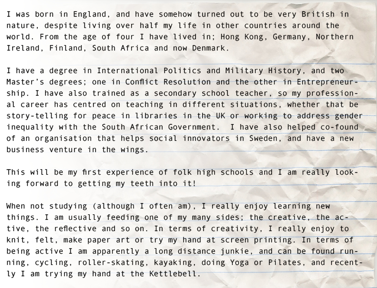 Sau tiết học đầu tiên buổi sáng là lớp học về sáng tạo (Innovativity) – lớp học mà chúng tôi phải rũ bỏ toàn bộ những suy nghĩ vướng bận trong đầu để tiếp nhận những gì mới mẻ và tinh khôi nhất sẽ đến. Cô giáo của lớp này là Felicity, một cô gíao người Anh có chồng người Đan Mạch. Đã từng sống ở Hongkong, Đức, Bắc Ailen, Phần Lan, Nam Phi và Đan Mạch, Felicity là người hướng ngoại và cũng như nhiều giáo viên khác ở trường luôn trăn trở để hướng tới một cuộc sống đích thực, ý nghĩa và đáng sống nhất. Felicity đồng thời cũng tham gia hoạt động trong lĩnh vực phi chính phủ và quan tâm đến hoà bình thế giới (cô có bằng về lịch sử quân sự, giải pháp hoà bình thế giới). Felicity là giáo viên tôi đã nói chuyện khá nhiều để nhờ tư vấn về những lớp học tôi nên chọn. Có lẽ là một người luôn trăn trở về những điều thú vị ở các góc khuất khác nhau của cuộc sống nên cô quyết định mở lớp Innovativity để cùng chúng tôi đào bới tìm hiểu về tiềm ẩn sáng tạo trong mỗi người. Và đã là sáng tạo thì cách học, cách tiếp cận và những gì chúng tôi tìm tòi cũng sẽ khác nhau. Ở buổi học đầu tiên chúng tôi được giao nhiệm vụ để kể lại những suy nghĩ trong đầu của mình bằng hình khối, màu sắc và vẽ lại mọi thứ trên giấy. Thú thật là tôi không giỏi lắm trong lĩnh vực hội hoạ lắm nhưng mãi về sau tôi mới nhận ra là môn học này thật sự ý nghĩa khi ta được dạy cách để bỏ qua những suy nghĩ cũ, tương tác cùng với những suy nghĩ mới trong đầu của chính mình và cả của những bạn bè xung quanh nữa.