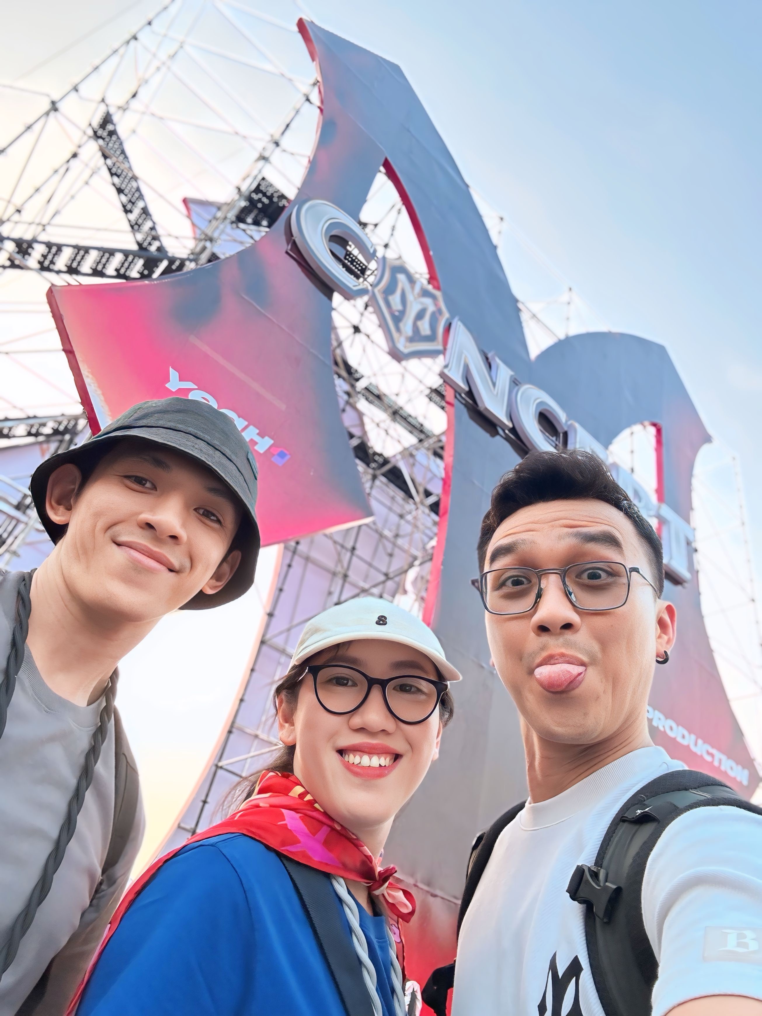 Mình từng có mặt ở Đêm 1 tại Thủ Đức, nhưng chẳng hiểu sao cảm giác bồi hồi khi đi đến Global City trong đêm D4 vẫn y nguyên như lần đầu tiên. Có lẽ, với âm nhạc, tụi mình chẳng bao giờ thật sự “quen” – vì mỗi lần gặp lại đều là một lần mới. Chiều ấy, mặt trời lặn ngay phía sau tấm khiên chữ “M”, như thể đang đếm ngược cho một điều gì đó thiêng liêng sắp bắt đầu. Chuyến bay đưa mình tới TP.HCM cũng tràn ngập “gai con” – fan của chương trình – từ mọi miền đất nước, mọi độ tuổi, tạo nên một cảm giác như thể mình đang bay cùng một cộng đồng có chung nhịp tim. Người người đổ về, từng nhóm bạn trẻ chụp ảnh, cười nói, lướt qua những gian booth rực rỡ sắc màu. Không khí náo nhiệt mà vẫn đầy chất thơ – như một thị trấn nhỏ chỉ hiện hữu mỗi khi đêm nhạc lên đèn.