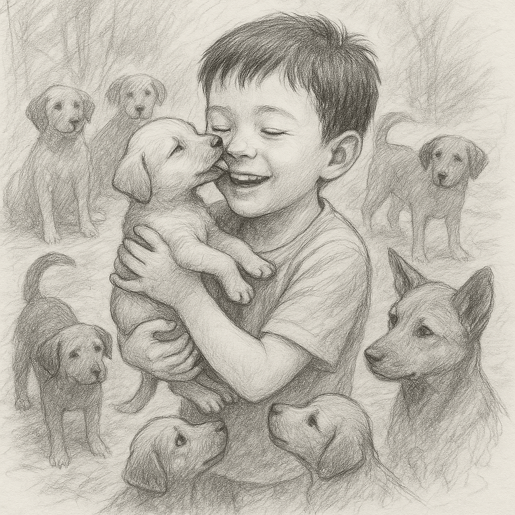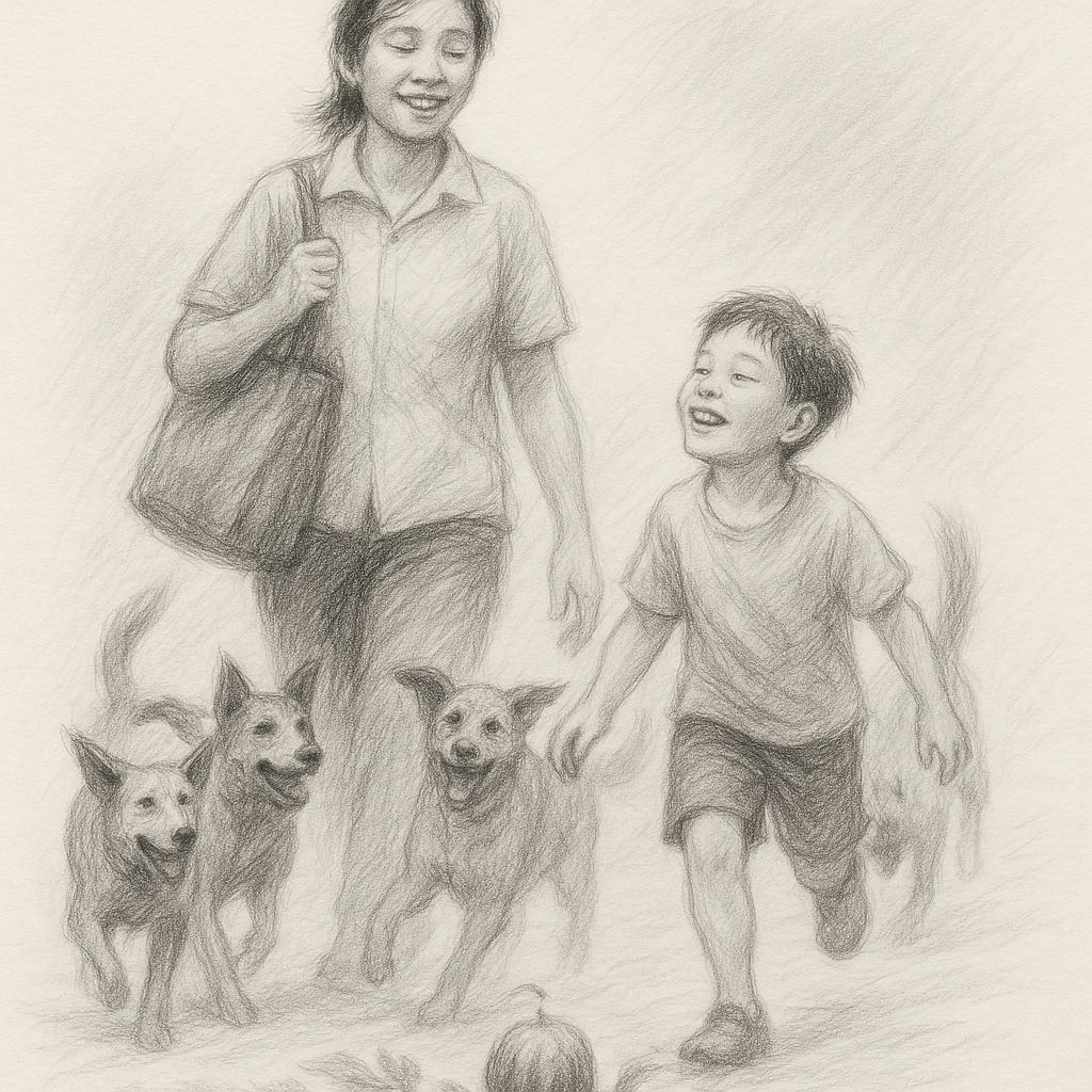 Mình yêu chó. Và ở đây cũng là thời gian mình chơi nhiều với cả một bầy chó, không chỉ của nhà mình mà còn của cả tất cả các nhà hàng xóm xung quanh: Ki gầy, Ki cụt, Mi lồ…Sau chú chó Mila ở Đông Xuyên, có thêm nhiều chú chó khác xuất hiện trong cuộc đời của mình. Mình tin mỗi con chó đều là một nhân vật – như một dạng người khác của tuổi thơ tôi. Chúng biết khi mẹ sắp về – chỉ bằng tiếng xe buýt từ xa. Chúng hú lên, và làm chân mình cũng rộn rã chạy theo – ra tận ngã tư để đón mẹ, trong đầu tưởng tượng mẹ sẽ mang về gì hôm nay: một túi cơm nguội, túi thịt chiên, trứng chiên, những món ăn mẹ để dành từ bếp của Công ty Hikosen nơi mẹ làm phụ bếp. Mẹ tiếp tục có những năm tháng tảo tần trong cái nghèo, túng nhưng khát vọng sống thì luôn căng tràn. Mẹ không kể lể. Mẹ chỉ lặng lẽ làm. Mình học được từ mẹ sự bền bỉ. Từ bố – là niềm tin vào tri thức.