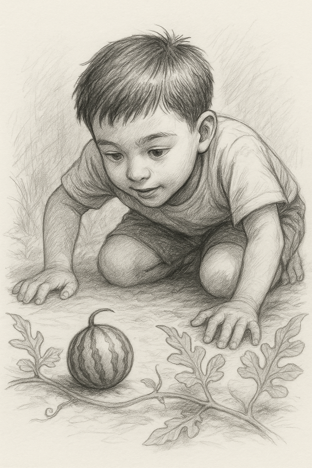 Sau nhà có một khoảng đất trống và một khu vườn hoang – nơi tôi vẫn gọi là “phim trường” của mình. Khu vườn ấy có một cây khế, vú sữa, nhiều loại cây khác, và có một đống đá to tàn dư lại sau xây dựng và một khoảng đất trống nơi mình lần đầu trồng dưa hấu bằng hạt và ngày ngày đều ra thăm bằng tất cả sự kiên nhẫn và tưởng tượng của một đứa trẻ không có nhiều đồ chơi. Mỗi buổi trưa, mình hay chạy ra vườn, chỉ để được nhìn thấy một thứ gì đó mình trồng, lớn lên từng chút một. Cái khoái cảm được tạo ra thế giới riêng – dù bé bằng bàn tay – với tôi là một kiểu quyền lực thuần khiết và bí mật. Mình làm hệ thống tưới nước cho cây và chờ đợi quả dưa đầu tiên thành hình… Quả đầu tiên và duy nhất chỉ bé bằng con chuột rồi héo đi trong sự tiếc nuối và ngơ ngác của thằng bé.