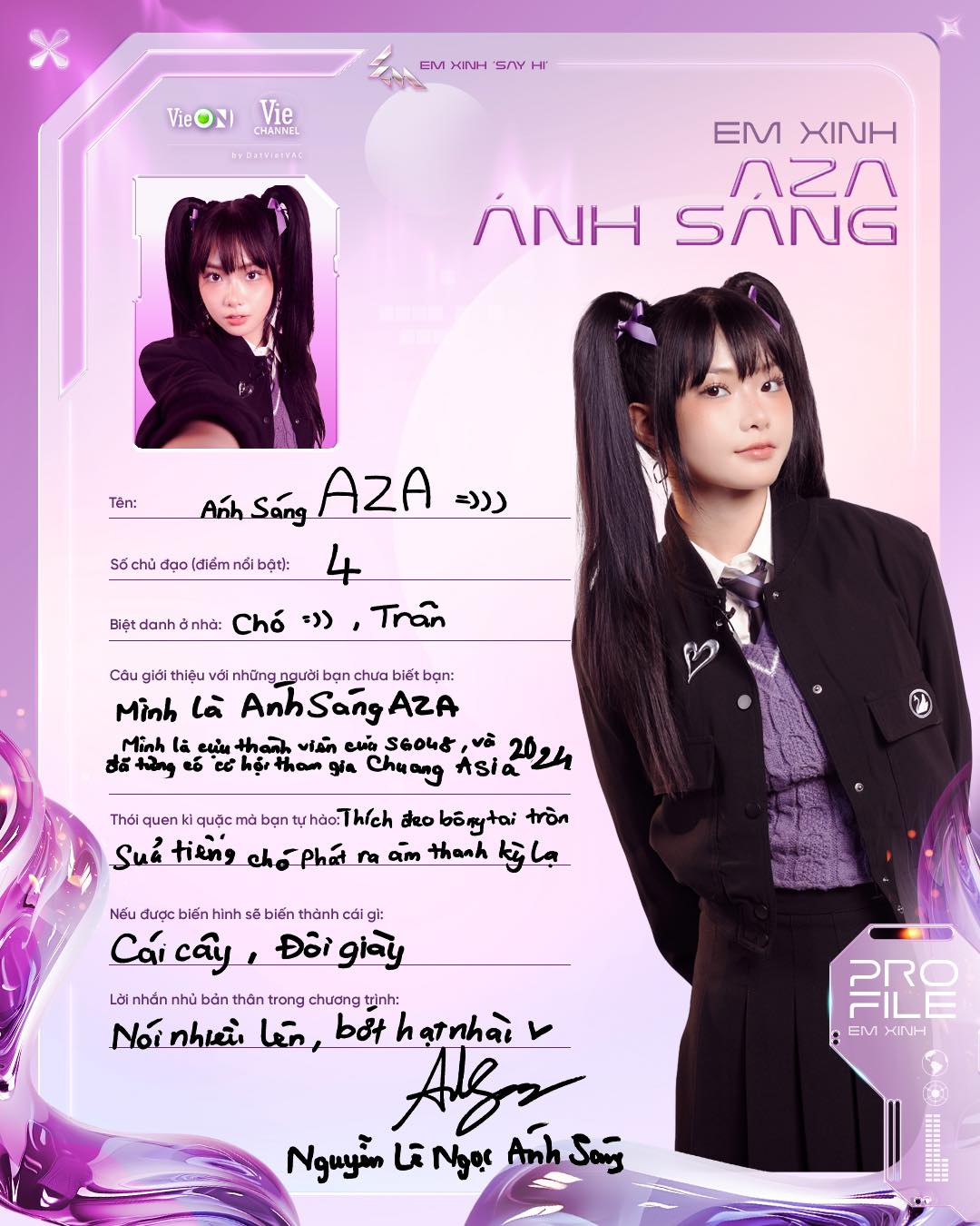 Là một trong những thí sinh trẻ tuổi nhất của Em Xinh Say Hi. Cô từng ra mắt công chúng từ năm 12 tuổi với vai trò thành viên nhóm nhạc SGO48, ghi dấu ấn bởi giọng hát tốt, vũ đạo cuốn hút và thần thái sân khấu nổi bật. Trước khi đến với chương trình này, Ánh Sáng AZA cũng từng tạo tiếng vang khi tham gia Chuang Asia 2024, nơi cô lọt vào top thí sinh được yêu thích dù chênh lệch tuổi đời với nhiều đối thủ. Tuổi trẻ hi vọng là tài sẽ càng cao