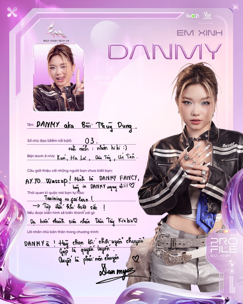 Là nữ rapper đến từ Hải Phòng, từng gây ấn tượng tại Rap Việt mùa 4 với bản rap “Giông bão” – lấy cảm hứng từ ca khúc gốc “Ngày chưa giông bão”. Với lời rap đầy cảm xúc và thông điệp mạnh mẽ về hành trình theo đuổi đam mê, DANMY đã chinh phục dàn huấn luyện viên và ban giám khảo. Cô là đại diện cho lớp nghệ sĩ trẻ đang mang đến làn gió mới, sâu sắc và giàu nội lực trong cộng đồng rap Việt.