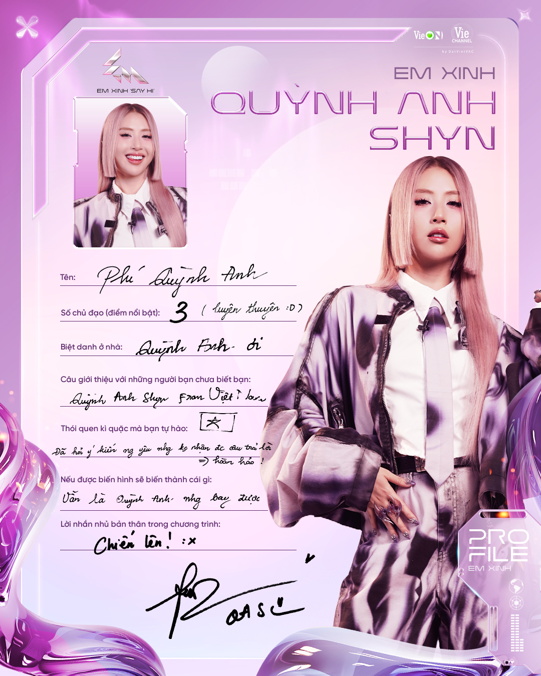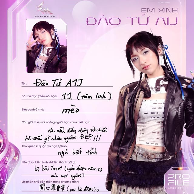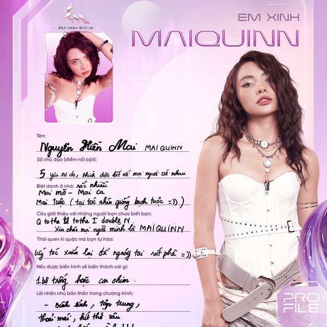 Từng là Á quân The Voice 2017 và học trò của Noo Phước Thịnh, nổi bật với giọng hát nội lực, khả năng sáng tác và chơi nhiều nhạc cụ. Trong Em Xinh Say Hi, cô gây “bão” ngay từ tập mở màn khi xuất hiện đầy cuốn hút trên sân khấu ca khúc AAA và khiến khán giả rung động với bản demo Chân Thành. Với visual sắc sảo và phong thái biểu diễn tự tin, MaiQuinn được kỳ vọng sẽ trở thành “phiên bản nữ của Dương Domic” – một nghệ sĩ đa tài có thể bứt phá mạnh mẽ tại show này.