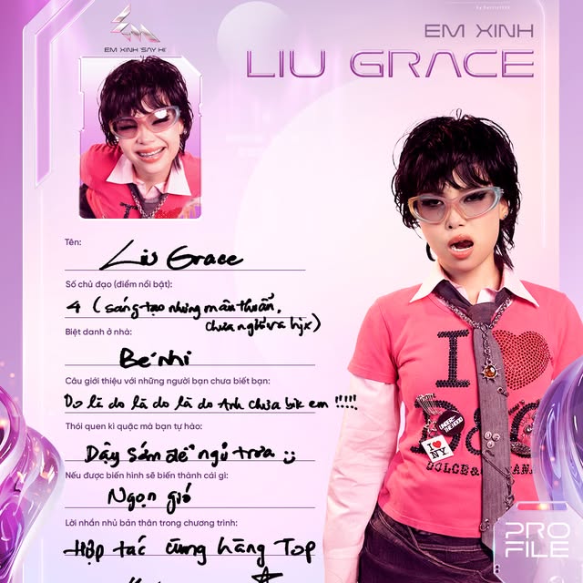 Liu Grace, tên thật là Trần Nguyễn Thanh Nhi, quê Đồng Nai, từng là nhân viên văn phòng trước khi quyết định rẽ hướng theo đuổi đam mê rap. Cô gây ấn tượng mạnh tại Rap Việt mùa 3 khi trở thành thí sinh nữ duy nhất vào chung kết và sở hữu nhiều bản hit triệu view như “Vành khuyên nhỏ”, “Có nhiều cái khó nói” hay “Take It Easy”. Ngày 30/5 vừa qua, Liu Grace chính thức phát hành EP đầu tay Bobby, đánh dấu bước chuyển mình từ hiện tượng mạng trở thành nghệ sĩ rap đầy tiềm năng trên đường đua âm nhạc chuyên nghiệp.
