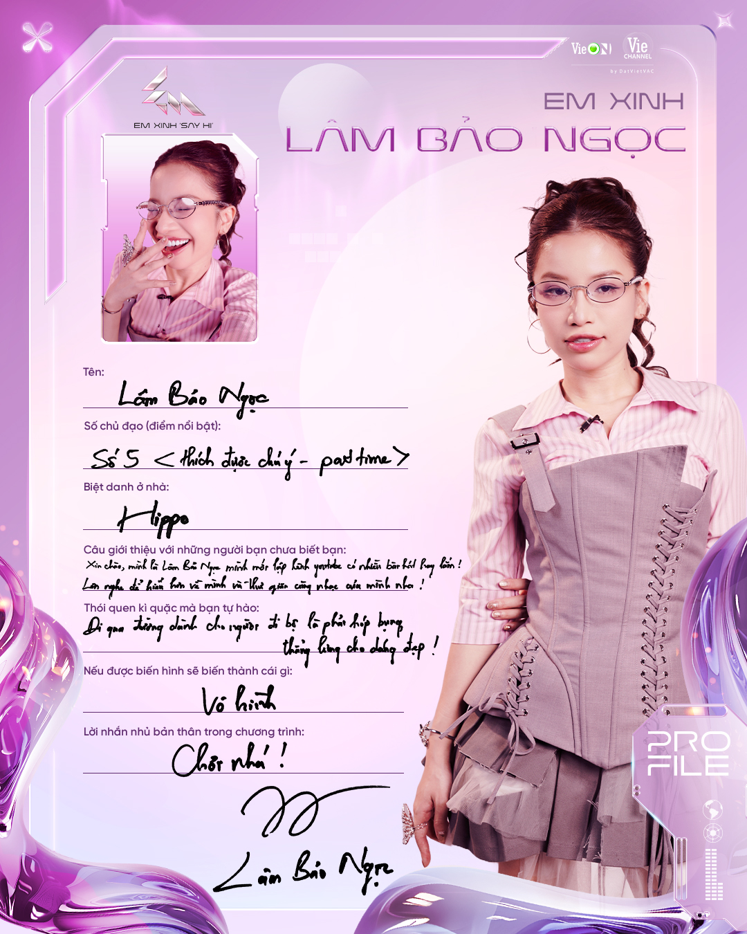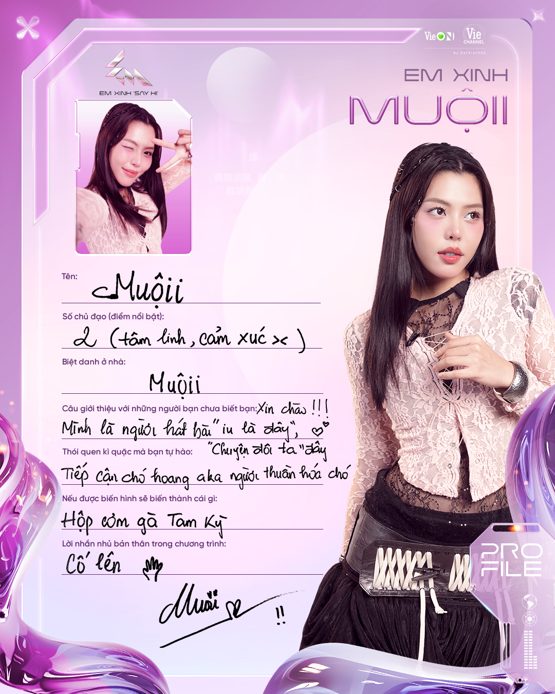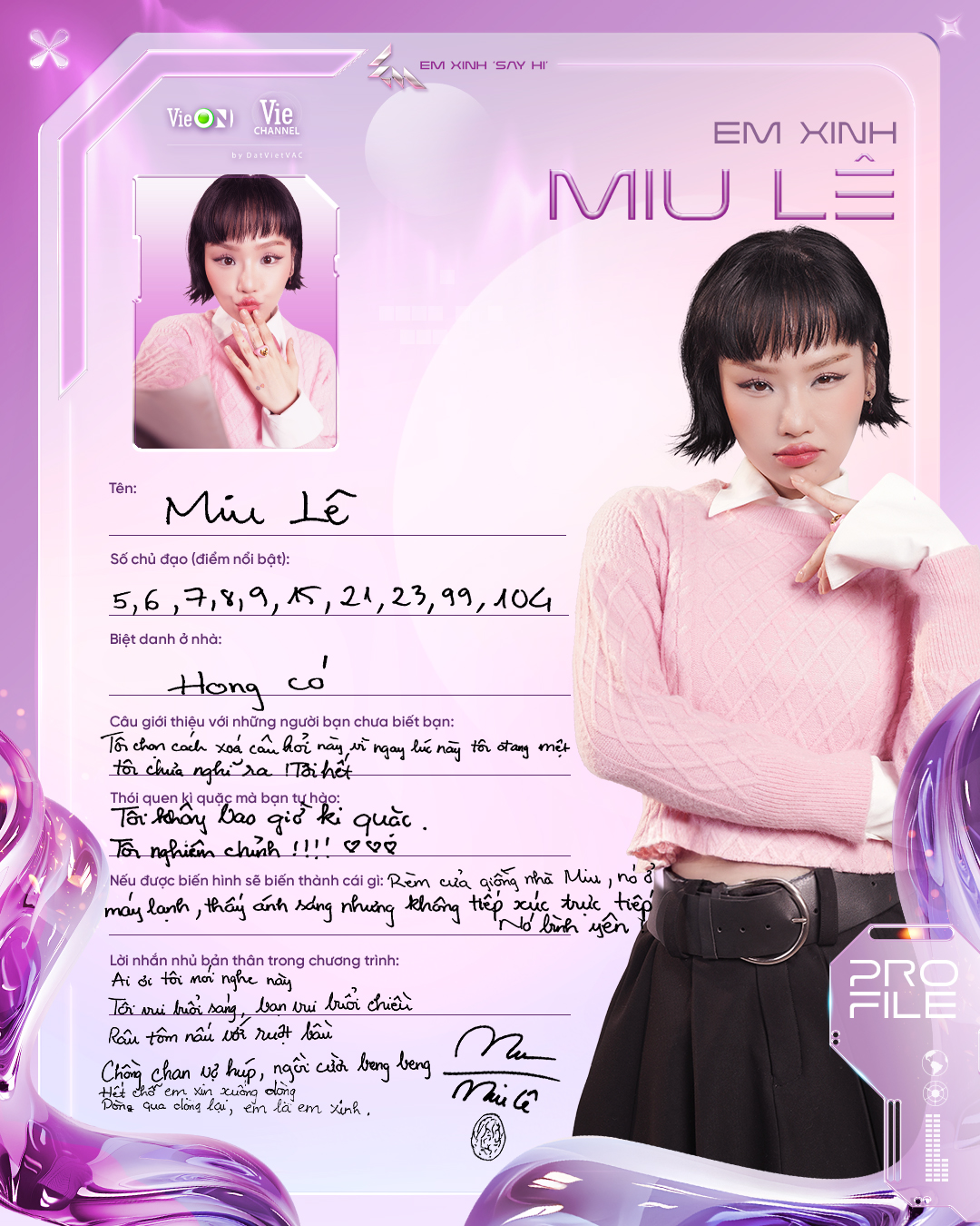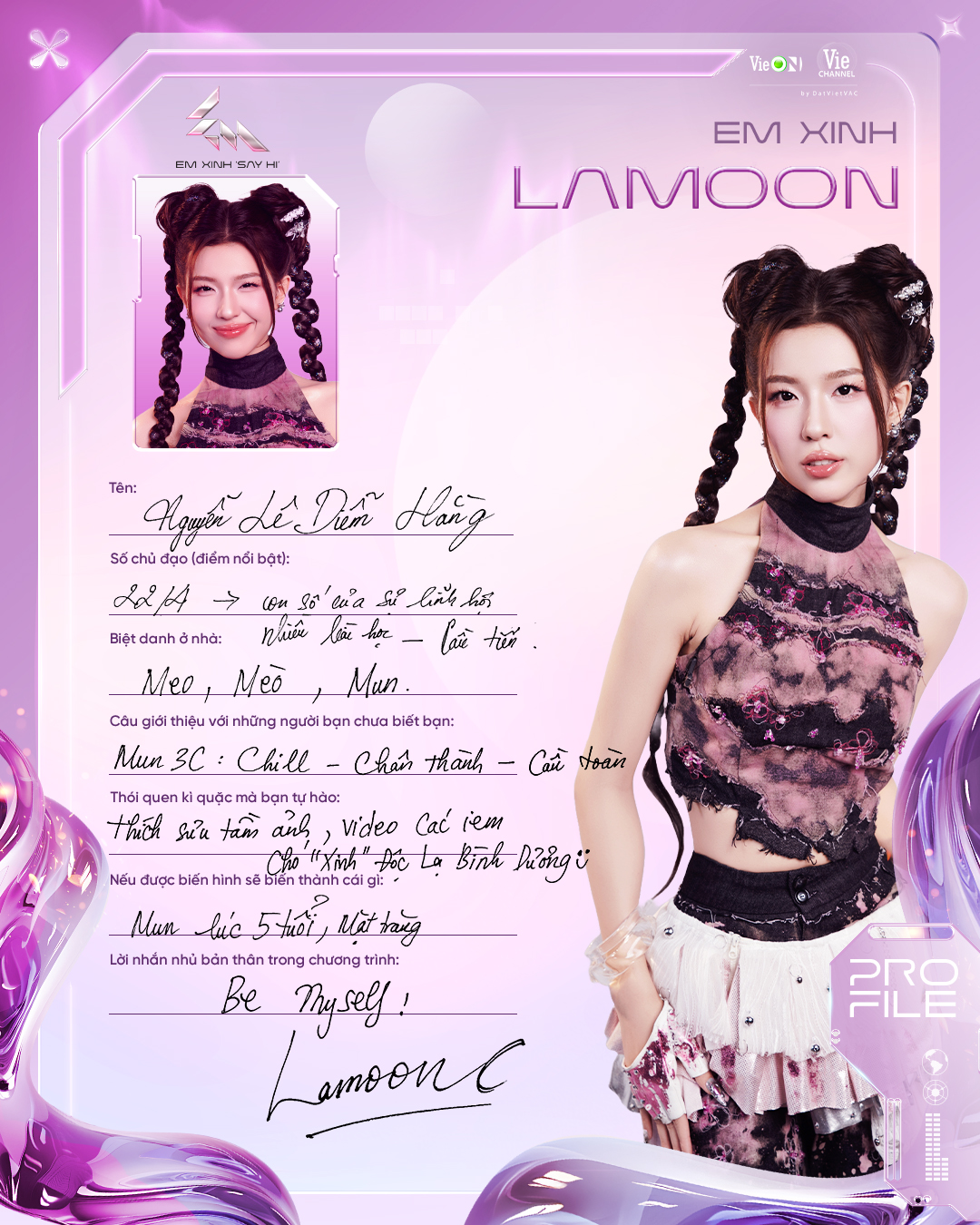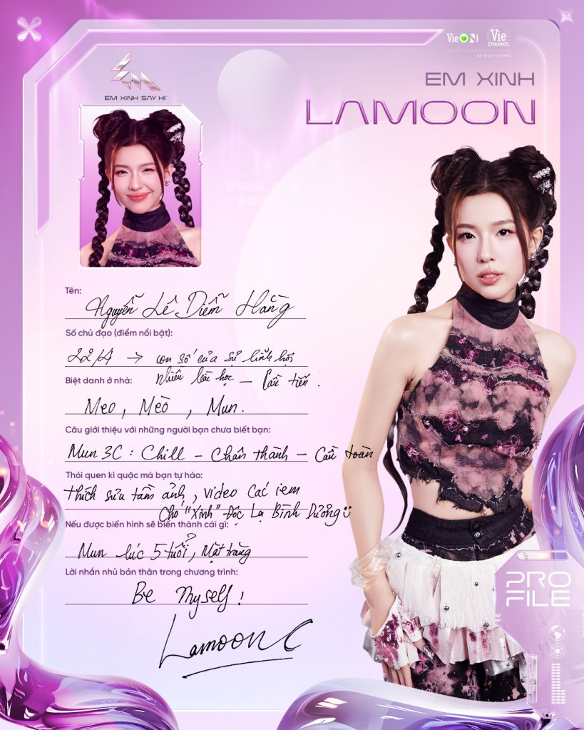 Ca sĩ trẻ, từng lọt Top 6 Vietnam Idol 2023. Lamoon là nghệ danh âm nhạc còn Diễm Hằng thì là diễn viên, cô được biết đến với vị trí Á khoa trường SKDA và vai diễn ấn tượng trong Địa Đạo. Âm nhạc và diễn xuất, nghe qua thôi là đã thấy vô vàn tiềm năng cho mùa Em xinh năm nay rồi.
