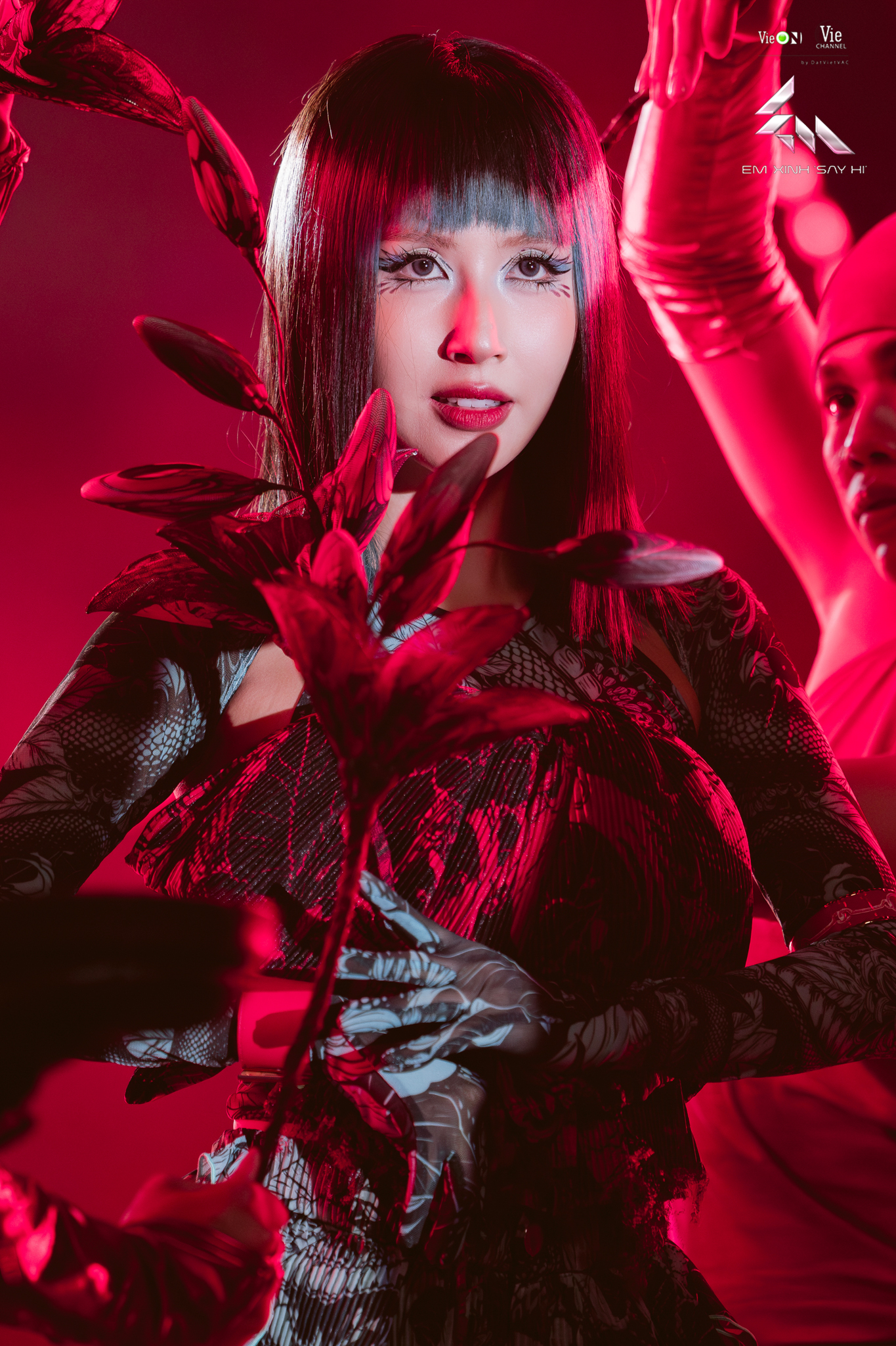 Với sự hỗ trợ từ Kye Nguyễn, phần tạo hình của Đồng Dao Xinh Gái không đi theo lối phục dựng mà chọn cách “tái sinh” dân gian trong ngôn ngữ thời trang đương đại. Áo yếm, hoạ tiết dân gian, kỹ thuật in hình xăm đặc trưng của Duc Studio, cùng bảng màu đỏ – xanh đối lập, tạo nên một đội hình vừa gợi nhắc truyền thống vừa bắt trend thị giác Gen Z.