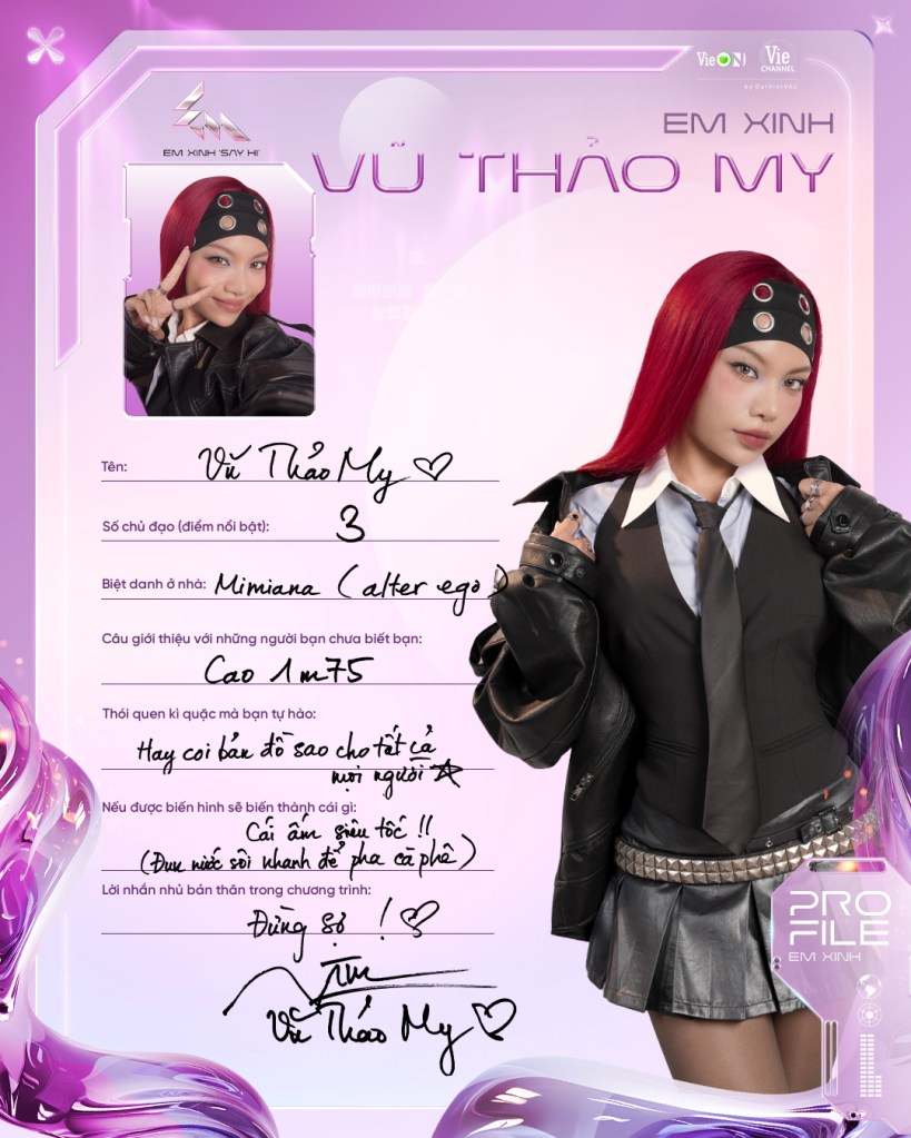 Quán quân The Voice Vietnam 2013, sở hữu giọng hát mạnh mẽ. Cô là một trong những thí sinh được kỳ vọng trong chương trình. Lần này ở Em xinh, Vũ Thảo My đã đem đến tóc đỏ để chứng tỏ cho cá tính và quyết tâm của mình đều nặng như nhau.