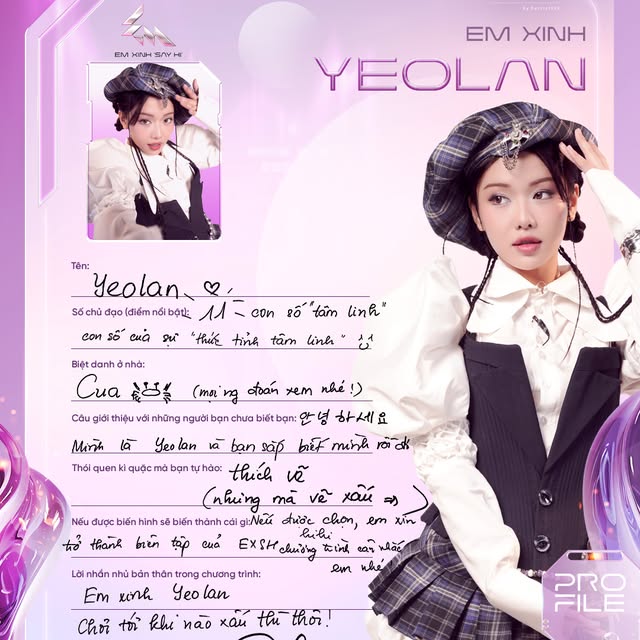 Là một gương mặt quen thuộc với cộng đồng yêu cái đẹp Việt và từng được truyền thông Trung Quốc như Sohu, Sina khen ngợi vì nhan sắc hút mắt. Tên thật là Trần Hoàng Phương Lan, cô từng theo học ngành Quan hệ Quốc tế tại Học viện Báo chí và Tuyên truyền, đồng thời gây chú ý qua các MV của Isaac và Trung Quân Idol. Không chỉ sở hữu thần thái nổi bật, Yeollan còn đa tài với khả năng chơi piano và từng là thành viên nhóm nhảy GUN Dance Team.