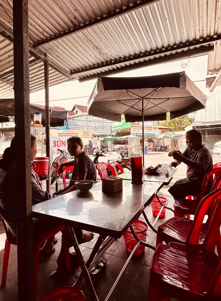Mười năm trước, tô cơm hến chỉ 10 nghìn. Giờ là 15 nghìn, vẫn là một bữa sáng rẻ mà ngon. Cơm nguội, quyện hến xào, rau sống thái sợi, lạc rang đỏ, da heo giòn, sa tế cay, và chén nước hến nóng bỏng tay, được chan vào khiến người ta xuýt xoa nhắm nghiền mắt khi ăn thìa đầu tiên. Như thể cả một quãng ký ức nghèo khó ùa về bám chặt các giác quan, tạo nên một bữa sáng vừa ngon, vừa cảm xúc. Dù ngon, tô cơm hến cũng khá tí hon với dạ dày buổi sáng. Tôi từng có lần ăn đến ba tô trong một chuyến ghé Huế. Nhưng lần này thì chỉ ăn một tô thôi, vì muốn nhường bụng cho bún bò Huế. Bún bò bây giờ thành món ăn quốc dân – ra Hà Nội ngày xưa là phải biết quán ở Quang Trung, ở đường Láng, giờ thì khu nào cũng có vài ba tiệm. Nhưng ăn bún bò ở Huế vẫn có cái vị riêng – đậm hơn, đã hơn. Và cũng như cơm hến, cái ngon đến từ không gian và tinh thần của quán. Quán tôi ăn nằm ngay cổng chợ – mà chợ thì luôn là một xã hội thu nhỏ. Vừa ăn, vừa quan sát, vừa lắng nghe giọng Huế vang lên qua những câu chuyện đô thị – cảm giác ấy không đâu có được.
