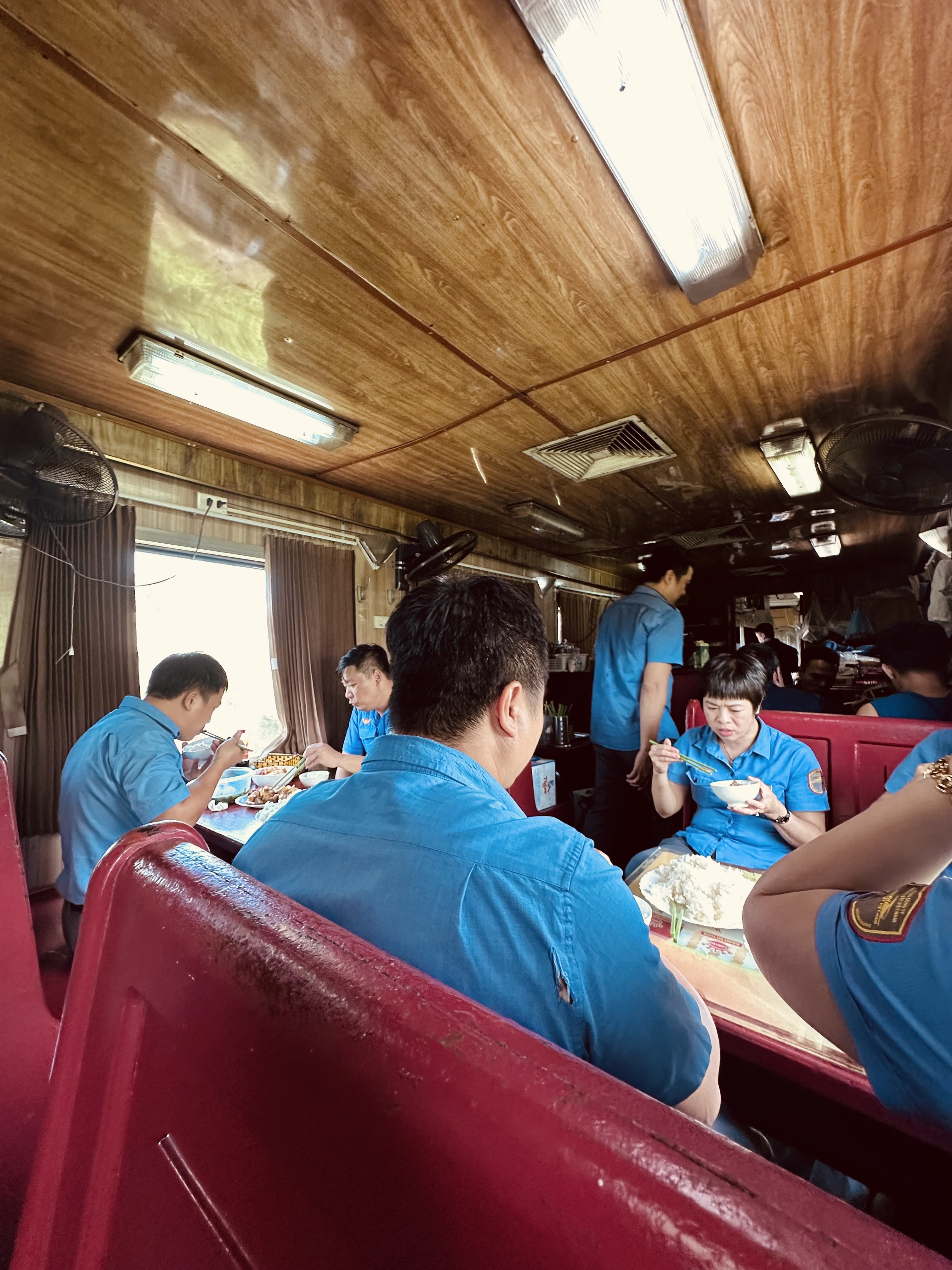 Tàu đến bằng tiếng loa phát thanh rộn ràng, bằng tiếng hành khách đứng dậy xếp hành lý, bằng tiếng còi tàu vọng lại từ xa rồi từ từ tiến vào. Mọi người lên khoang, hoà cùng hành khách từ Hà Nội và các ga trước, một xã hội thu nhỏ trong không gian lắc lư nhưng đầy sinh động. Tôi không ở chỗ ngồi, vì hành trình Huế – Đà Nẵng không dài, mà lại đẹp miên man. Toàn bộ vẻ đẹp miền Trung – rừng, biển, đèo – như một màn hình LED khổng lồ ở ngay ngoài cửa sổ. Tôi chọn một chỗ quen thuộc, toa căn tin, nơi có thể nghe những câu chuyện hoả xa từ các nhân viên đường sắt. Tôi từng có chuyến tàu xuyên Việt với những kỷ niệm dịu ngọt, từng dừng bất ngờ ở Quảng Bình – đã kể trong Việt Nam ngoài cửa sổ. Lần này, tôi lại ngồi đó – nghe những câu chuyện rôm rả vào bữa trưa, giữa những khung cảnh ngoài kia đang trôi qua đầy tự hào.