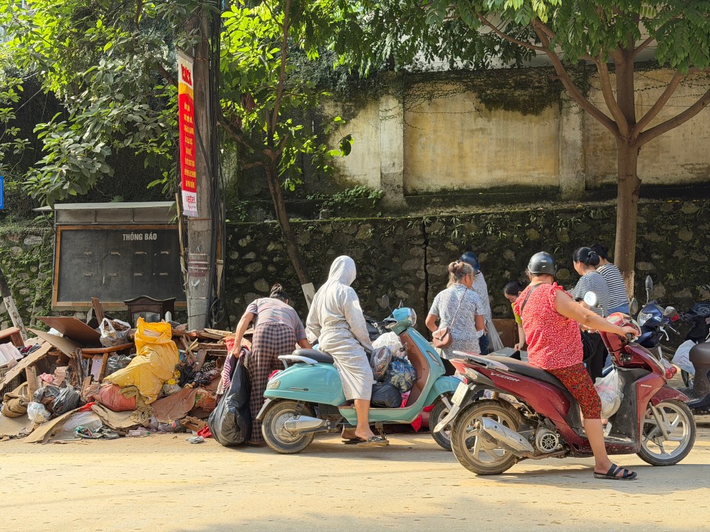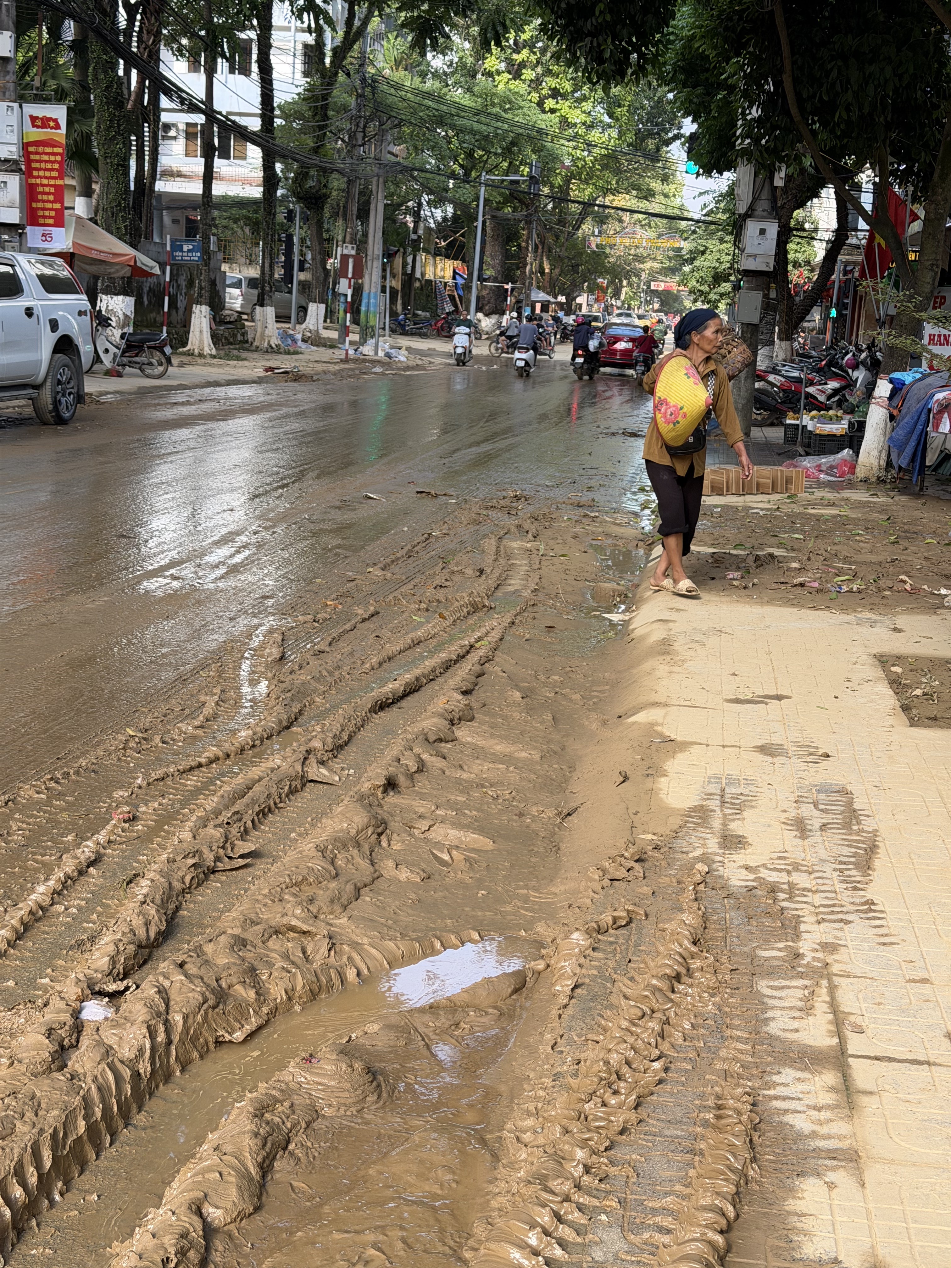 Tôi lên Cao Bằng bằng xe đêm, đến nơi lúc rạng sáng ngày 4/10. Thành phố sau trận hồng thủy vẫn còn lưu dấu vết rõ rệt. Quanh khu Chợ Xanh, những đống đồ đạc bị bùn đất bám vào chất cao như núi bên lề đường. Tủ lạnh, ghế sofa, quần áo, đồ chơi trẻ em… tất cả đều nhuốm màu nâu đen của bùn. Thỉnh thoảng vẫn có người cố bới trong đống bùn, tìm kiếm thứ gì đó còn dùng được để đem về.