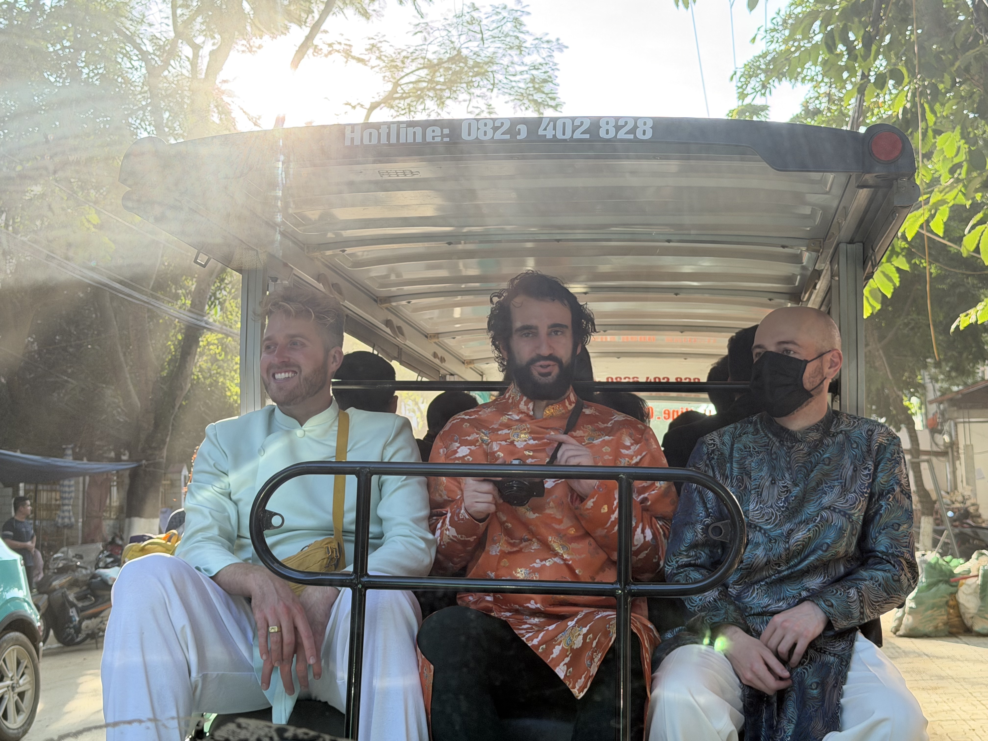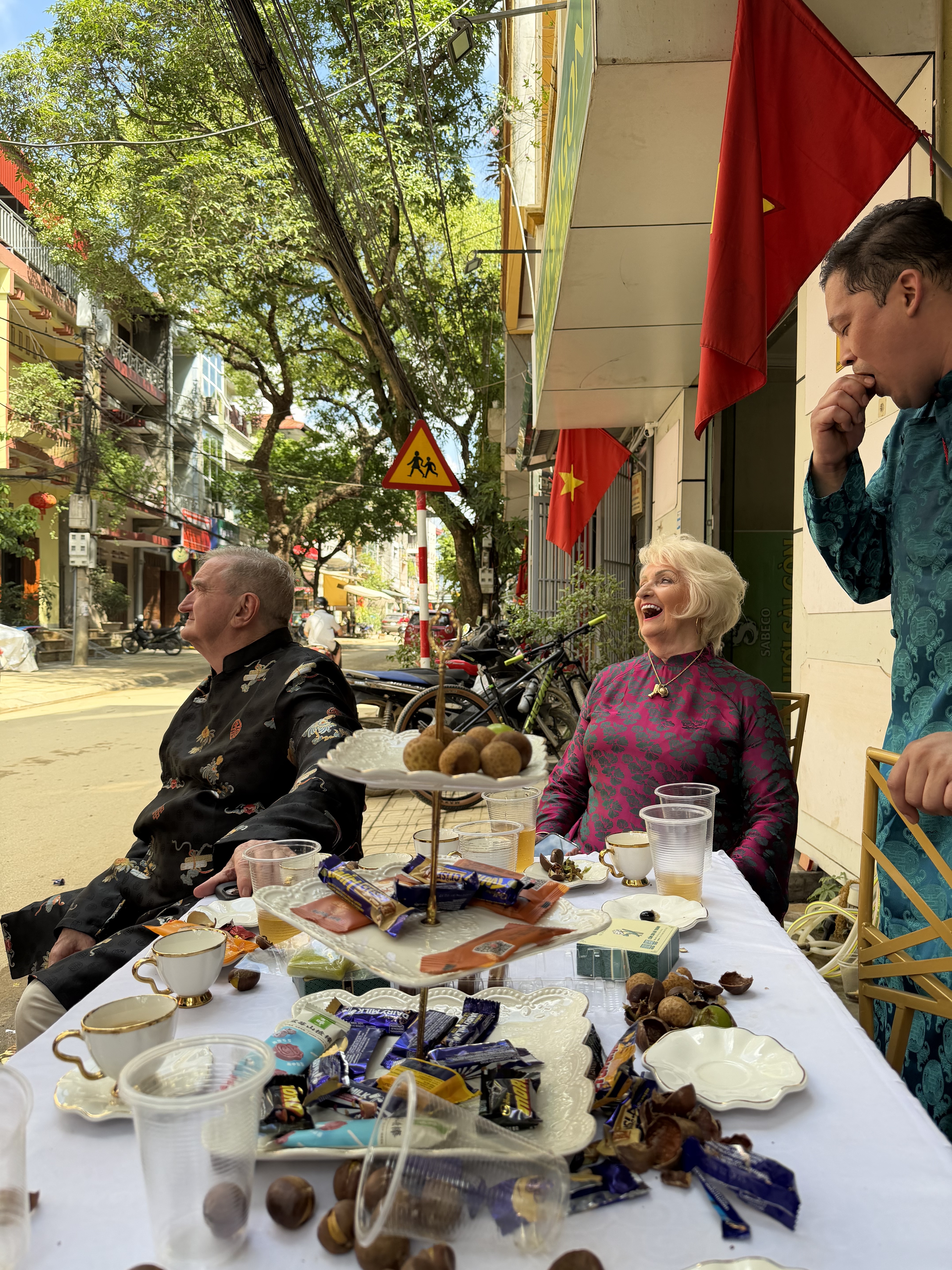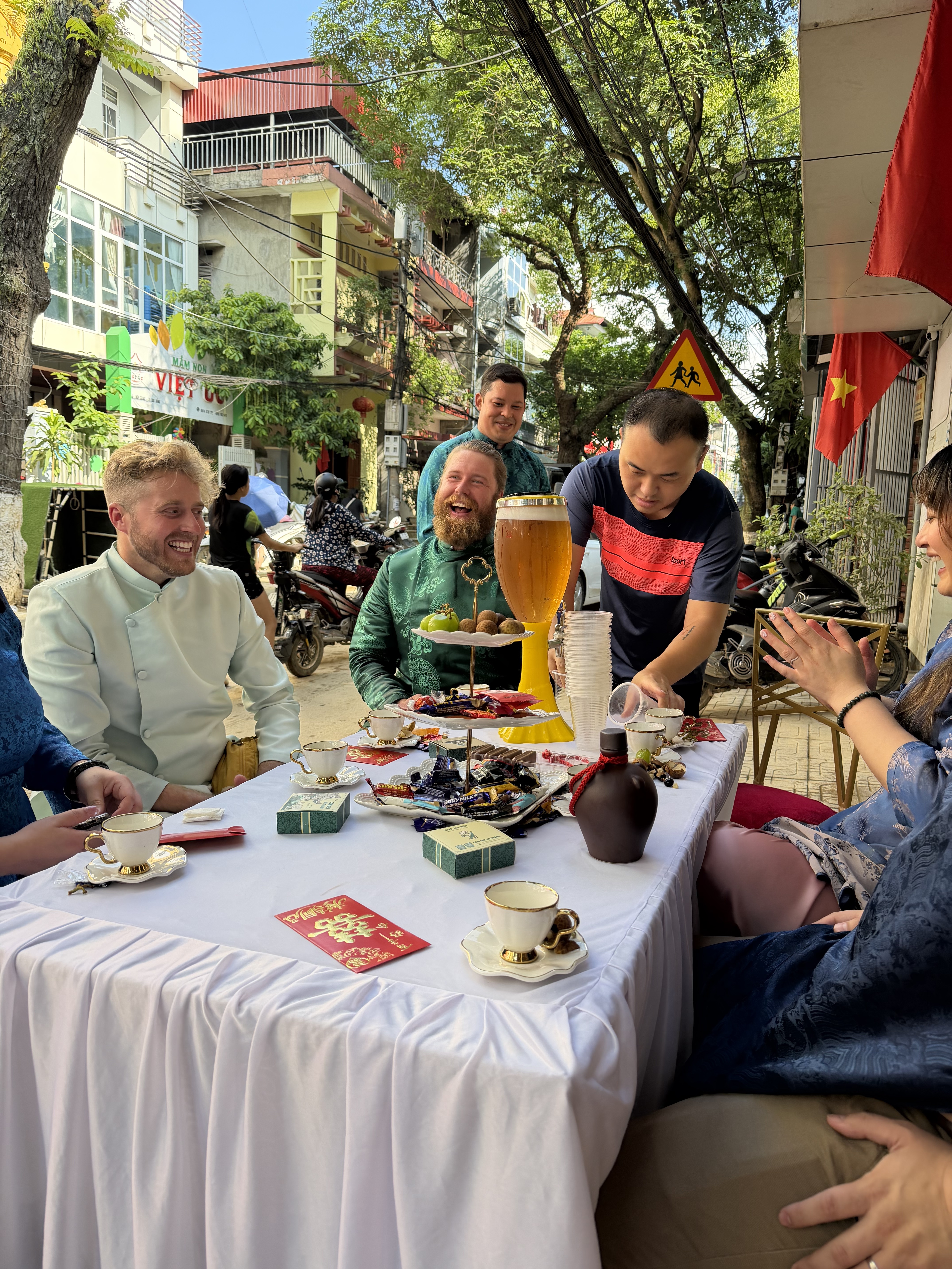 Buổi sáng, lễ đón dâu diễn ra trong không khí ấm cúng nhưng cũng rất vui nhộn. Gia đình hai bên chào đón nhau. Những người bạn nước ngoài ngồi xung quanh, tò mò quan sát từng nghi lễ truyền thống. Họ chụp ảnh, quay video, hỏi han về ý nghĩa của từng món quà, từng cử chỉ.
