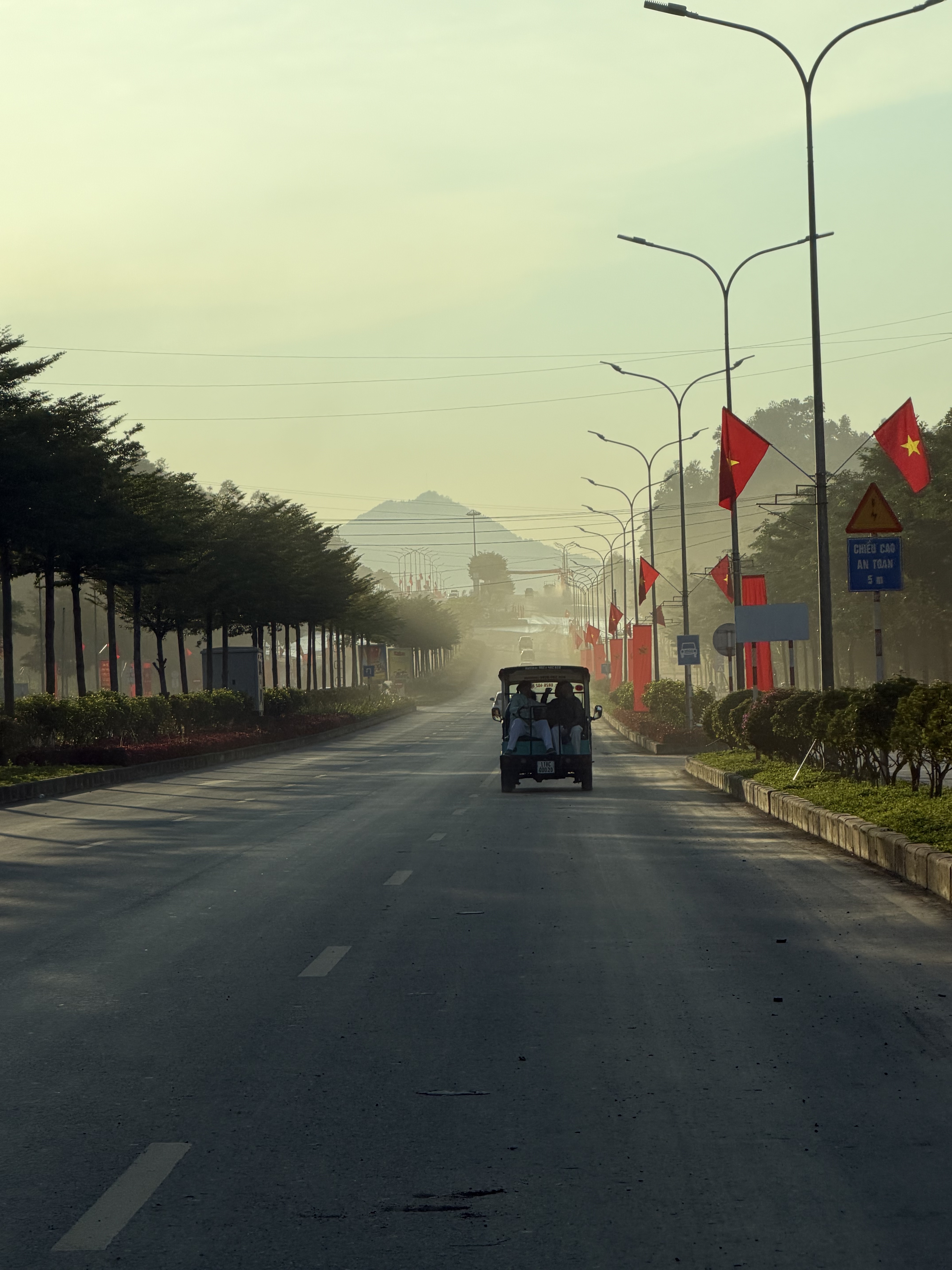 Từ tượng đài, cả đoàn đi xe điện ra quảng trường khu trung tâm hành chính mới của Cao Bằng để ngắm hoàng hôn. Quảng trường rộng lớn, bản chất là không gian dành cho mọi người. Và chiều Chủ nhật sau bão lũ này, nơi đây đông người đến lạ thường.