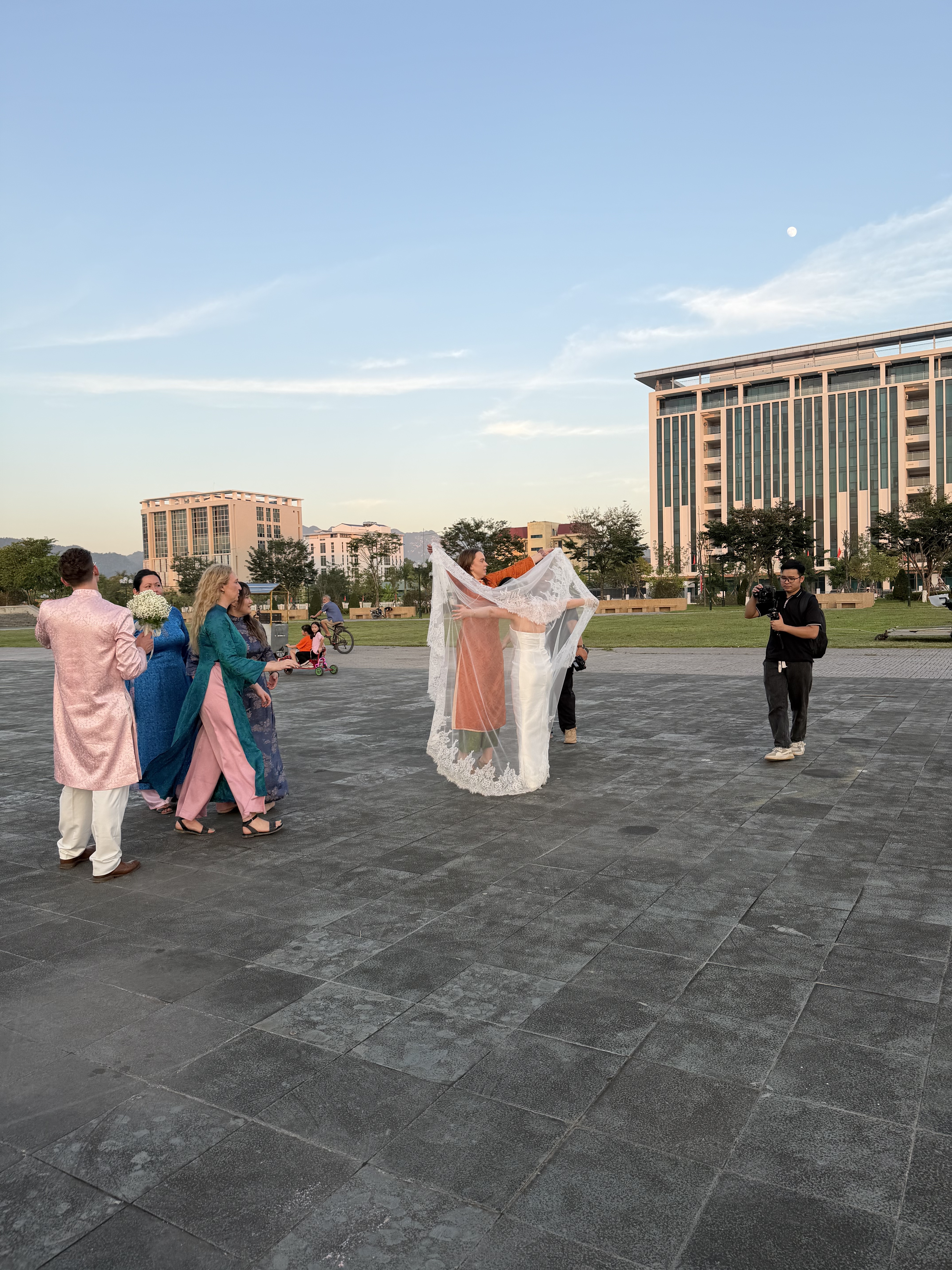 Các em nhỏ chạy nhảy, đạp xe hai bánh, xe ba bánh khắp quảng trường. Tiếng cười nói rộn rã. Các bạn nước ngoài trong đoàn cưới cũng mua xèng, tham gia chơi cùng các em. Quanh quảng trường, những gánh hàng rong bán xiên nướng đủ loại: xiên bẩn, xiên que, xiên nướng sa tế… Cùng đủ loại nước uống từ trà đá, dừa lạnh đến nước ngọt.