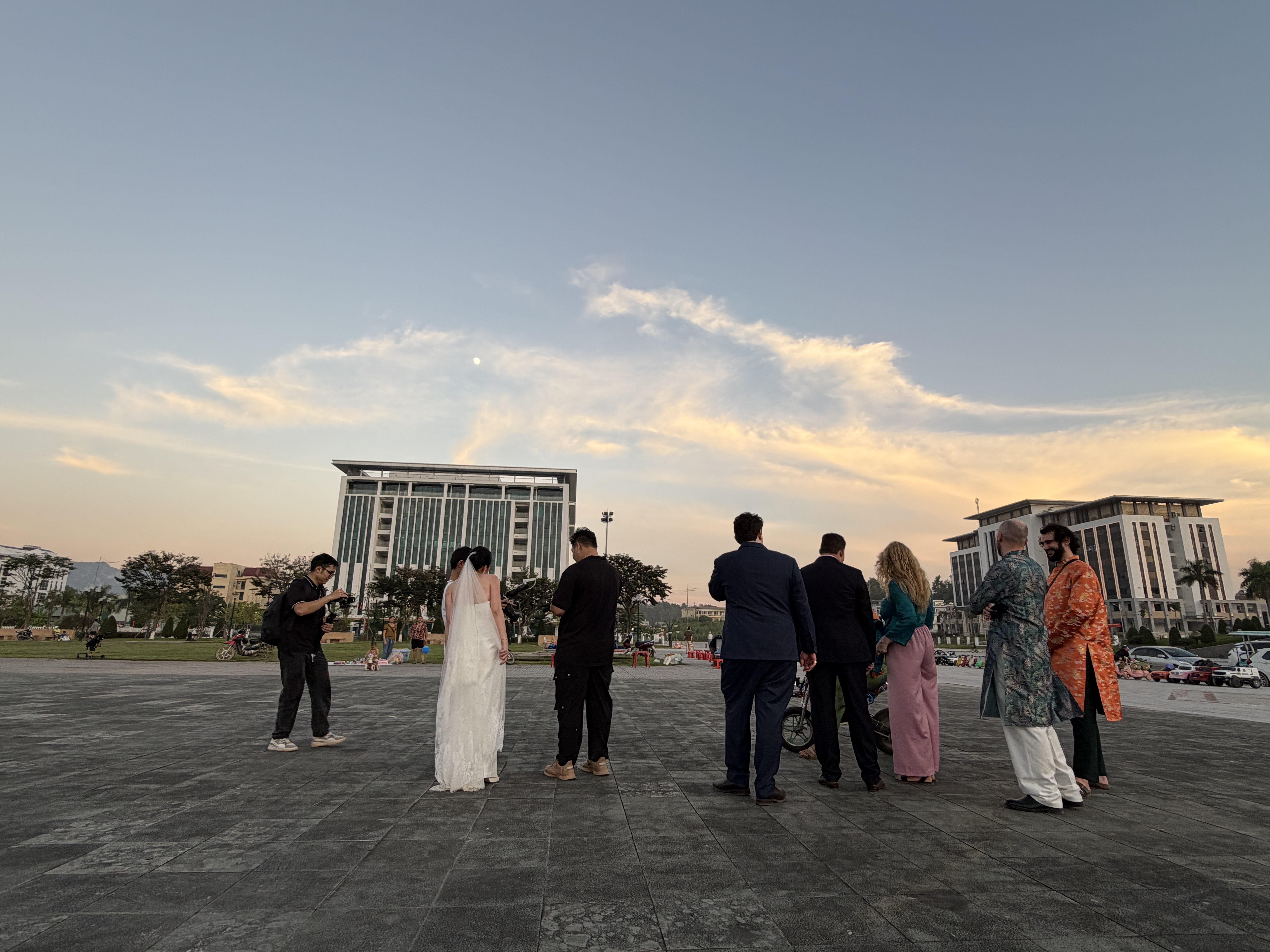 Không ai định trước, nhưng tự nhiên nó trở thành một bữa tiệc BBQ giữa hoàng hôn. Mọi người mua xiên, mua dừa, ngồi vòng tròn trên bậc thang quảng trường. Cô dâu chú rể còn nguyên trang phục cưới, ngồi giữa đám đông. Các cặp vợ chồng bạn bè, gia đình hai bên, các em nhỏ… tất cả cùng nhau trong ánh hoàng hôn rực rỡ của Cao Bằng.