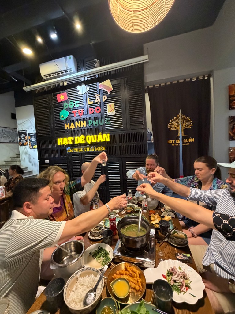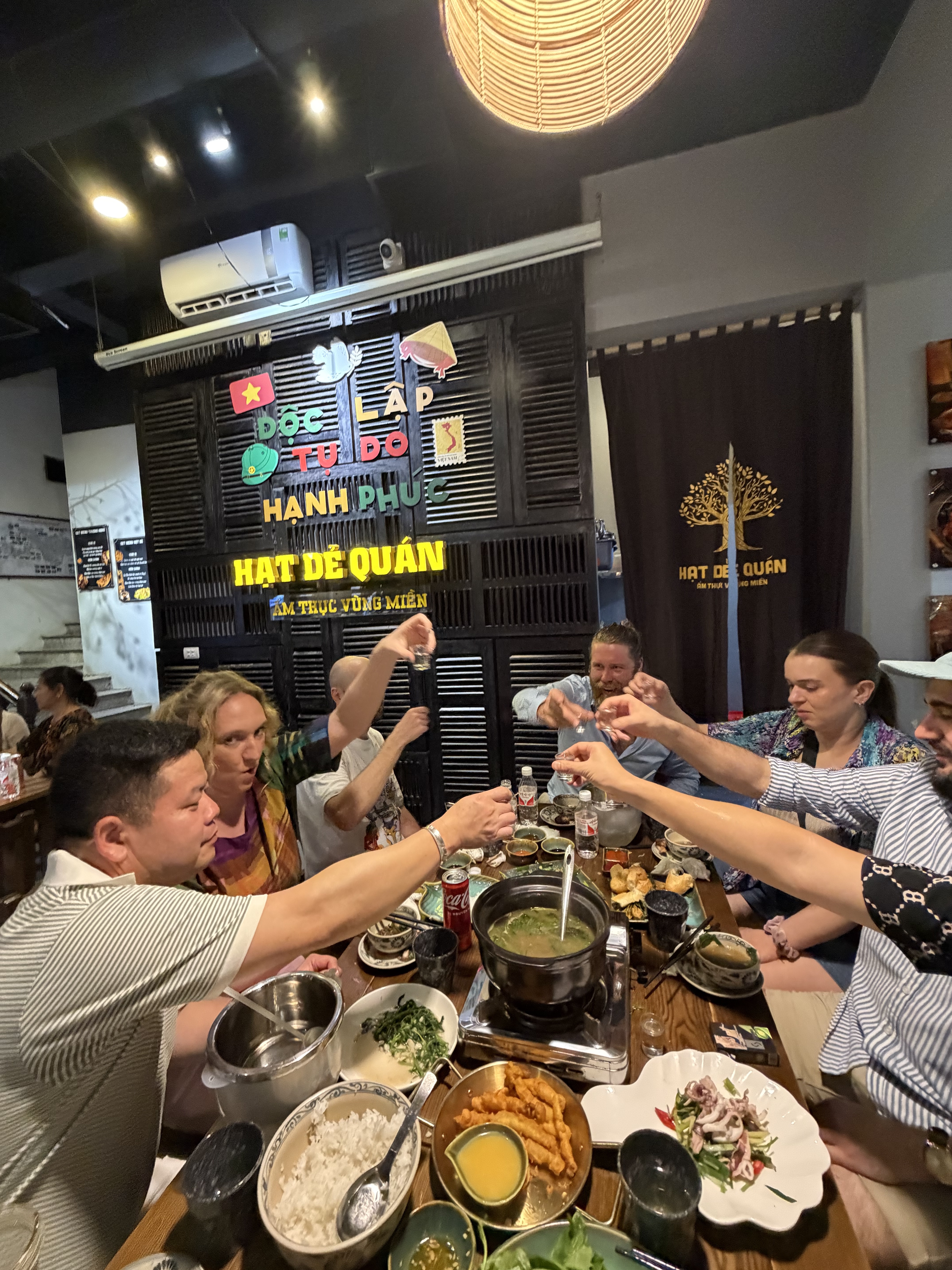 Trưa, tiệc cưới được tổ chức tại nhà hàng nhỏ gần nhà – thay vì Mường Thanh như kế hoạch ban đầu. Không gian tuy không hoành tráng nhưng đầy ắp tình cảm. Đặc sản Cao Bằng được dọn lên: thịt trâu gác bếp, cá suối nướng, rau rừng, nộm bò khô… Tiếng cười vang, câu chuyện kể về những trải nghiệm vừa qua – về việc kẹt trong bão, về việc cùng nhau dọn dẹp đường phố, về việc lần đầu tiên uống bia hơi Việt Nam…