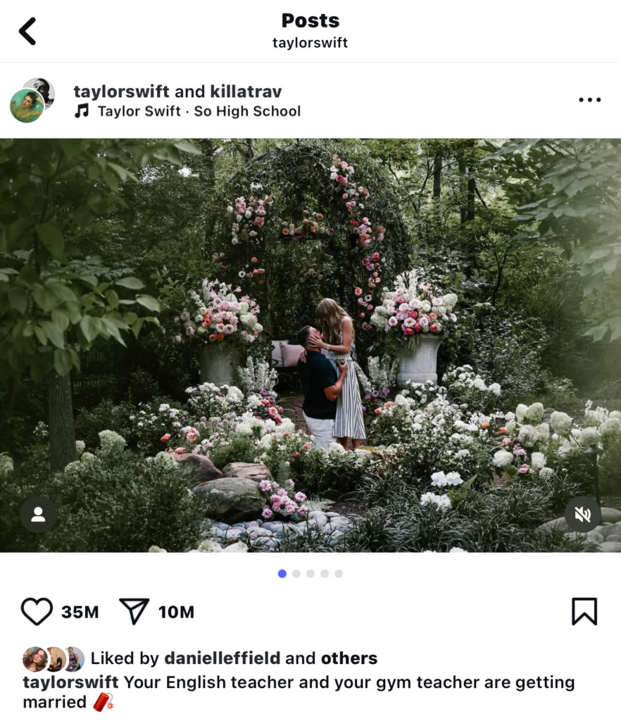 Hiệu ứng “mọi khoảnh khắc là sự kiện” không dừng ở âm nhạc. Khi Taylor Swift và Travis Kelce công bố đính hôn vào cuối tháng 8/2025, đó lập tức trở thành đợt lan truyền thương mại lớn nhất mà một mối quan hệ người nổi tiếng từng tạo ra. Chiếc váy kẻ đen trắng trong ảnh đính hôn được Ralph Lauren giảm giá 20% và bán sạch gần như ngay lập tức. Panera Bread tung combo sourdough “lấy cảm hứng từ Taylor” chỉ trong vòng chưa đầy một ngày sau khi cô nhắc đến bánh mì men chua trong podcast của Kelce. Spotify báo cáo lượt nghe tăng vọt gần 400% cho “So High School”, bản tình ca được cho là viết về Kelce. Có cả concept proposal theo kiểu của Taylor Swift nữa. Ở cấp độ này, tình yêu cá nhân cũng trở thành một phần của franchise – một nhánh nội dung đóng vai trò nuôi dưỡng mạch cảm xúc cho toàn bộ vũ trụ.