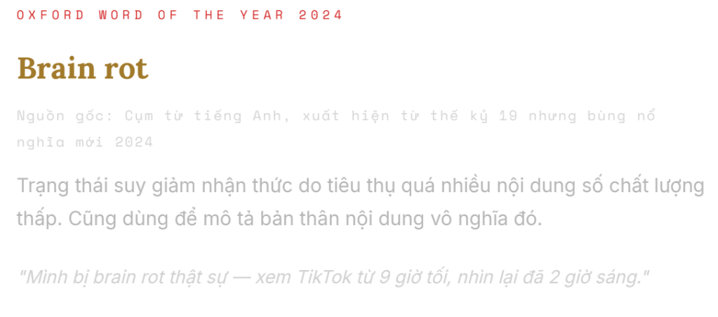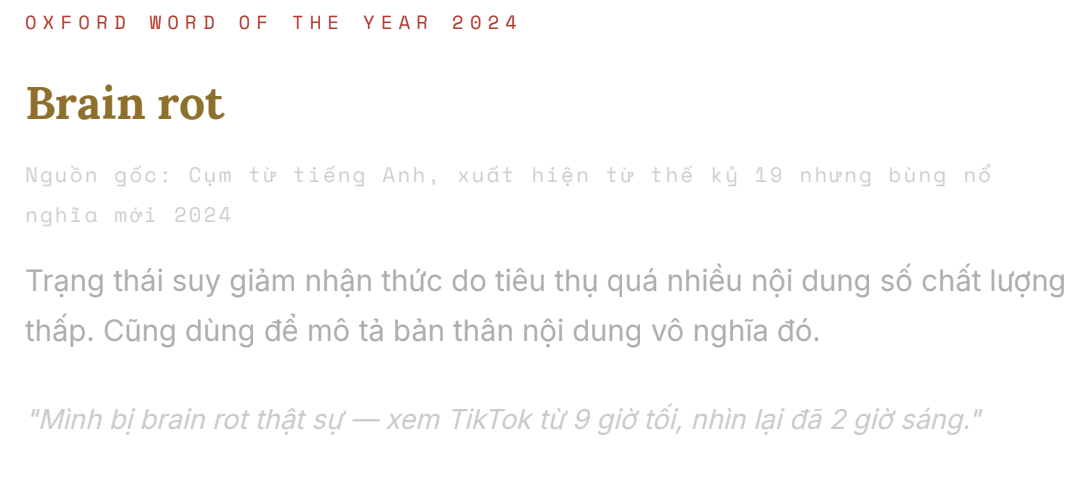 Mỗi năm, Oxford University Press chọn một “Word of the Year” — từ phản ánh tinh thần của thời đại. Năm 2024, từ được chọn là brain rot. Không phải ngẫu nhiên. Đây là từ mô tả chính xác nhất trạng thái tâm trí sau khi ngồi cuộn màn hình quá lâu — tình trạng não bộ bão hòa, mất khả năng tập trung, chỉ tiêu thụ nội dung vô nghĩa mà không còn suy nghĩ sâu.