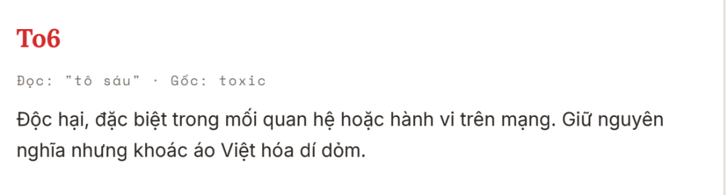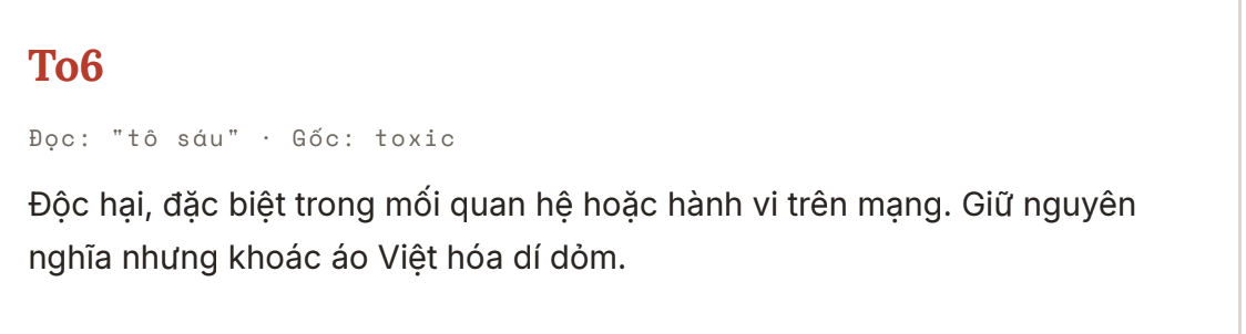 Hãy nhìn vào “toxic”. Trong tiếng Anh, từ này đã quen thuộc từ lâu. Nhưng giới trẻ Việt Nam không chỉ mượn nguyên — họ sáng tạo ra “to6”: giữ âm “to”, thay “xic” bằng số 6 (phát âm như “six”), tạo ra một từ vừa nghe lạ tai, vừa tiết kiệm ký tự, vừa mang cả một tầng hài hước riêng. Đây không phải là lười biếng ngôn ngữ — đây là sáng tạo ngôn ngữ.