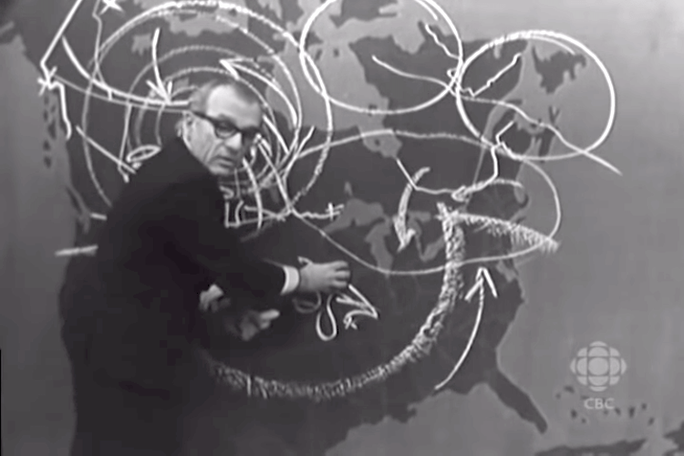 Năm 1952, Percy Saltzman trở thành MC thời tiết đầu tiên trong lịch sử truyền hình Canada trên kênh CBC – với công cụ duy nhất là tấm bảng đen và viên phấn. Ông nổi tiếng có thói quen tung phấn lên trời rồi bắt lấy khi kết thúc bản tin, trở thành một “thương hiệu” đặc trưng. Người giữ kỷ lục dẫn thời tiết lâu nhất thế giới được ghi nhận chính thức là Peter Coade của CBC với 54 năm liên tục từ 1962 đến 2016.