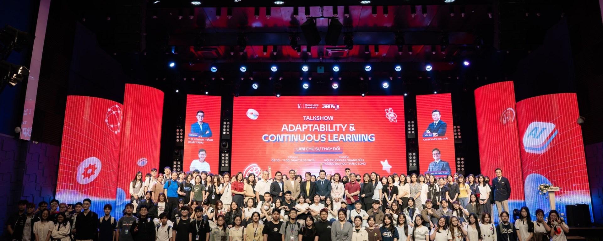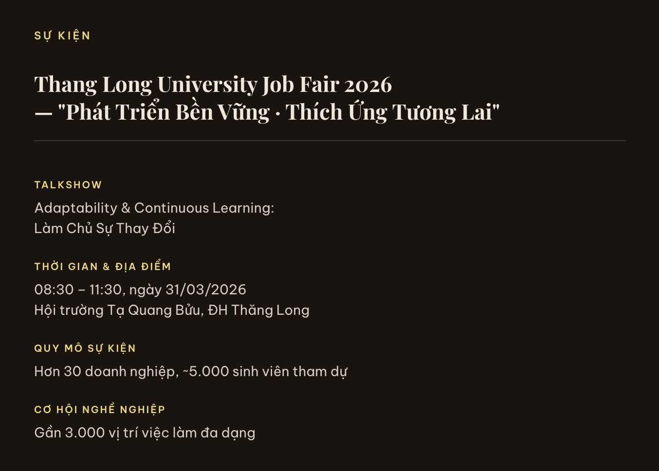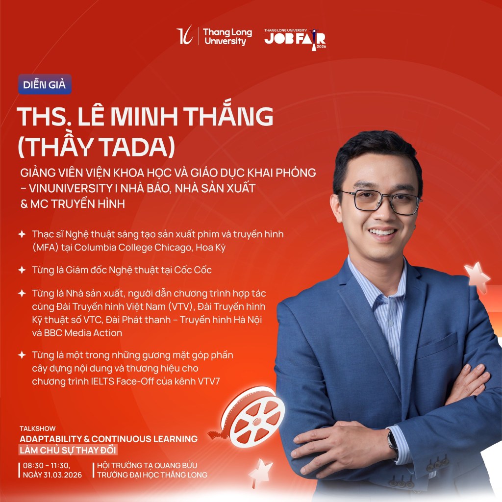 Thang Long University Job Fair 2026 năm nay mang chủ đề “Phát triển bền vững – Thích ứng tương lai”. Một câu chủ đề nghe có vẻ hành chính, nhưng chứa đựng một câu hỏi rất thật: Làm sao để một người trẻ không bị bỏ lại phía sau trong một thế giới đang xoay với tốc độ chưa từng có?