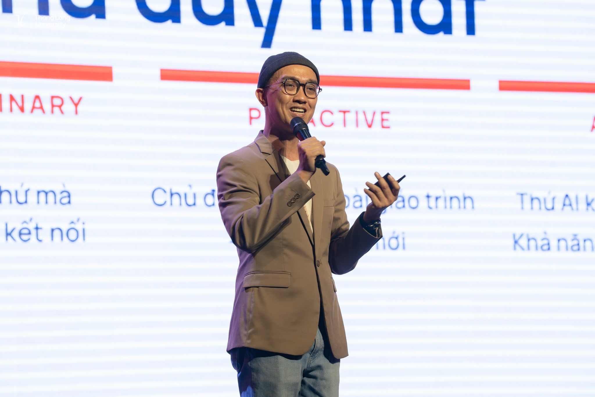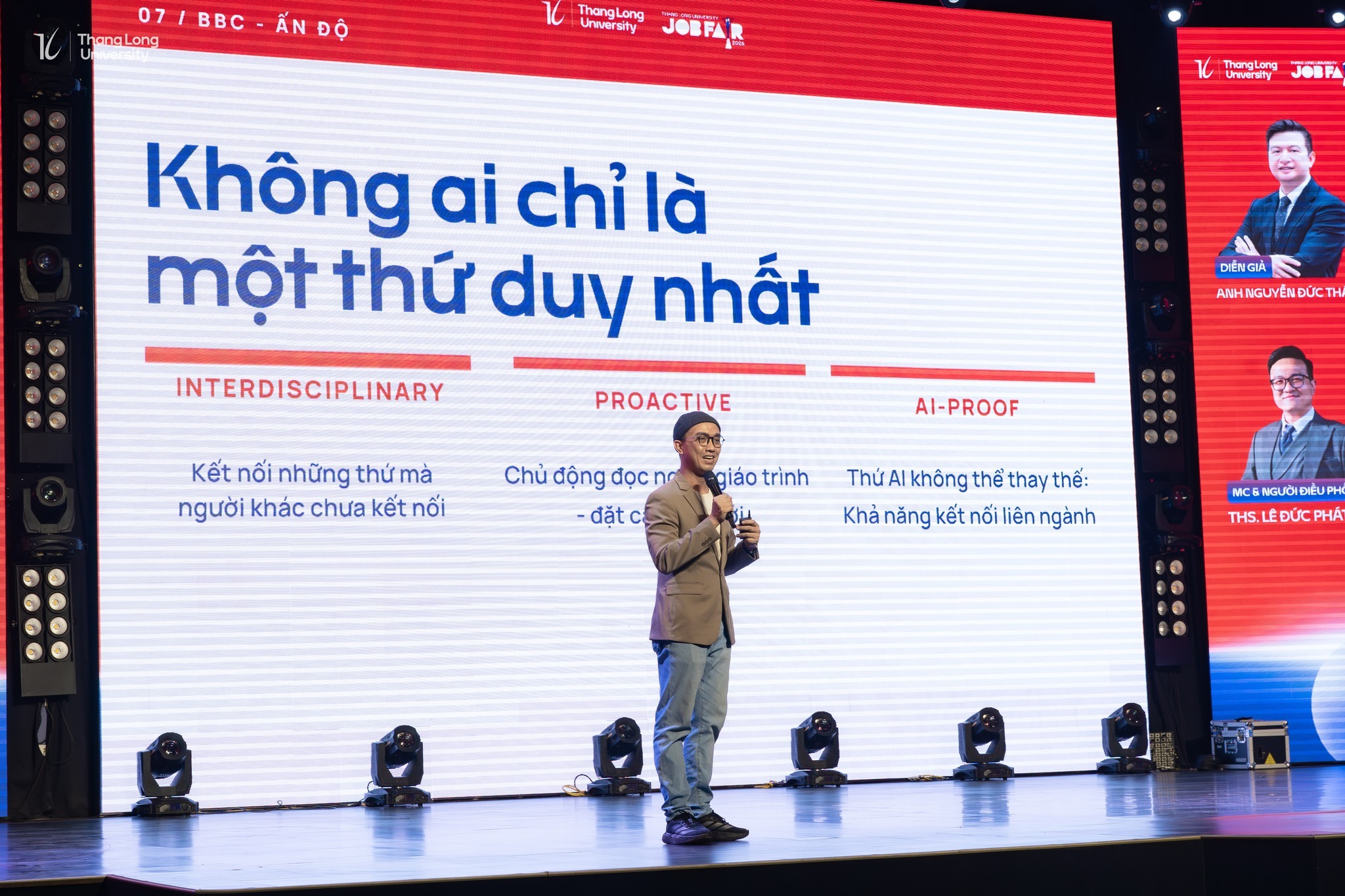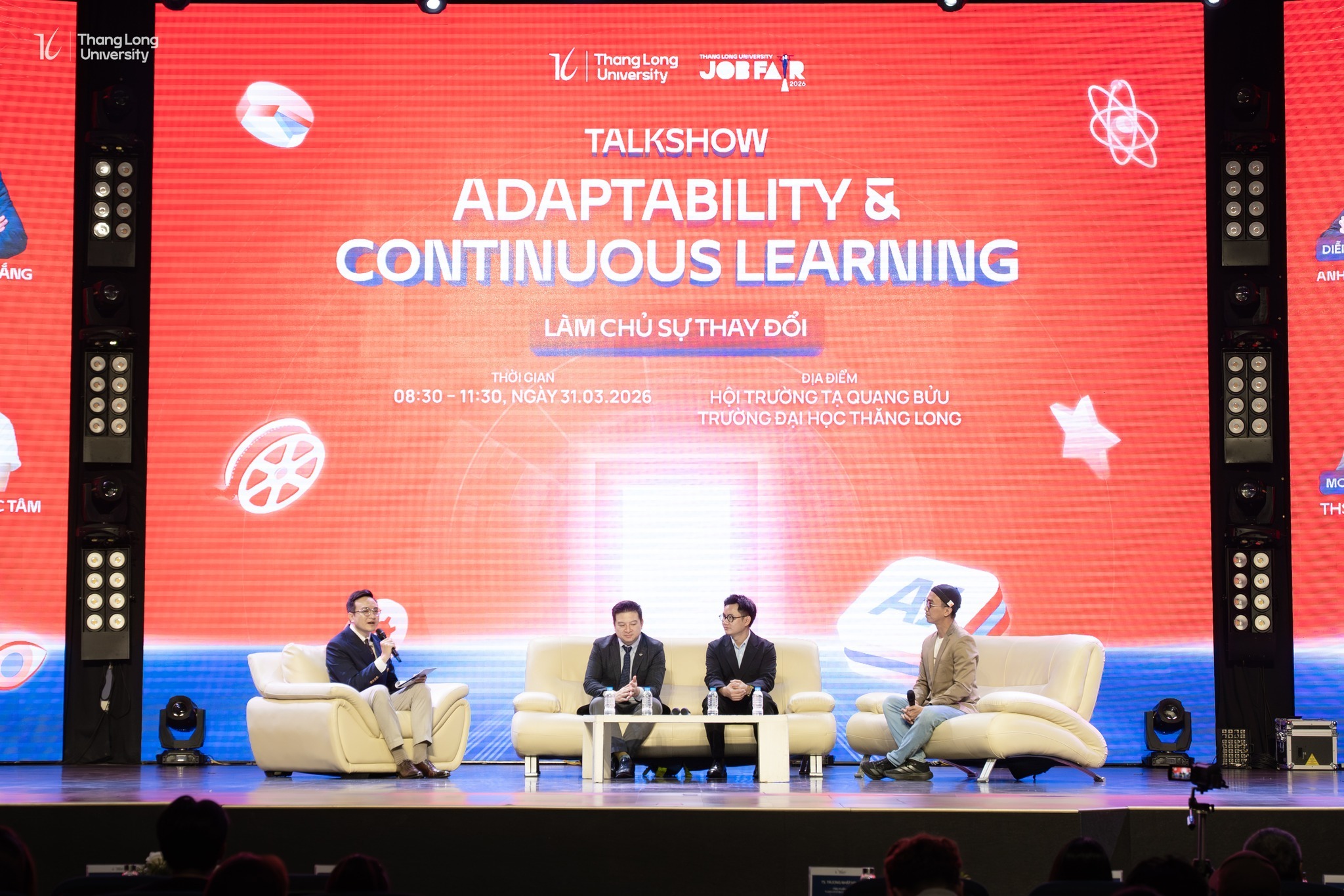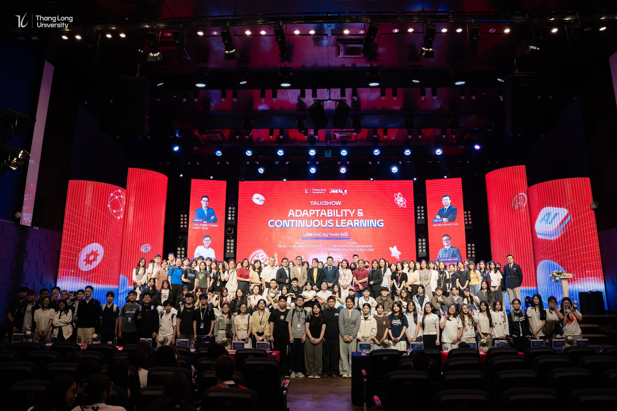 Tôi có cơ hội đồng hành cùng hai diễn giả trên cùng sân khấu sáng hôm đó — anh Nguyễn Đức Thái, Giám đốc Vận hành Công ty Cổ phần Giáo dục SAPP; và ThS. Dương Đức Tâm, Founder hệ thống kênh Yangdexin, cựu sinh viên ngành Ngôn ngữ Trung Quốc K29 của chính Trường Đại học Thăng Long. Toàn bộ buổi talkshow được dẫn dắt bởi ThS. Lê Đức Phát, giảng viên Bộ môn Quản trị Kinh doanh và Marketing của trường — người giữ cho cuộc trò chuyện vừa mạch lạc, vừa sống động suốt gần 3 tiếng đồng hồ.