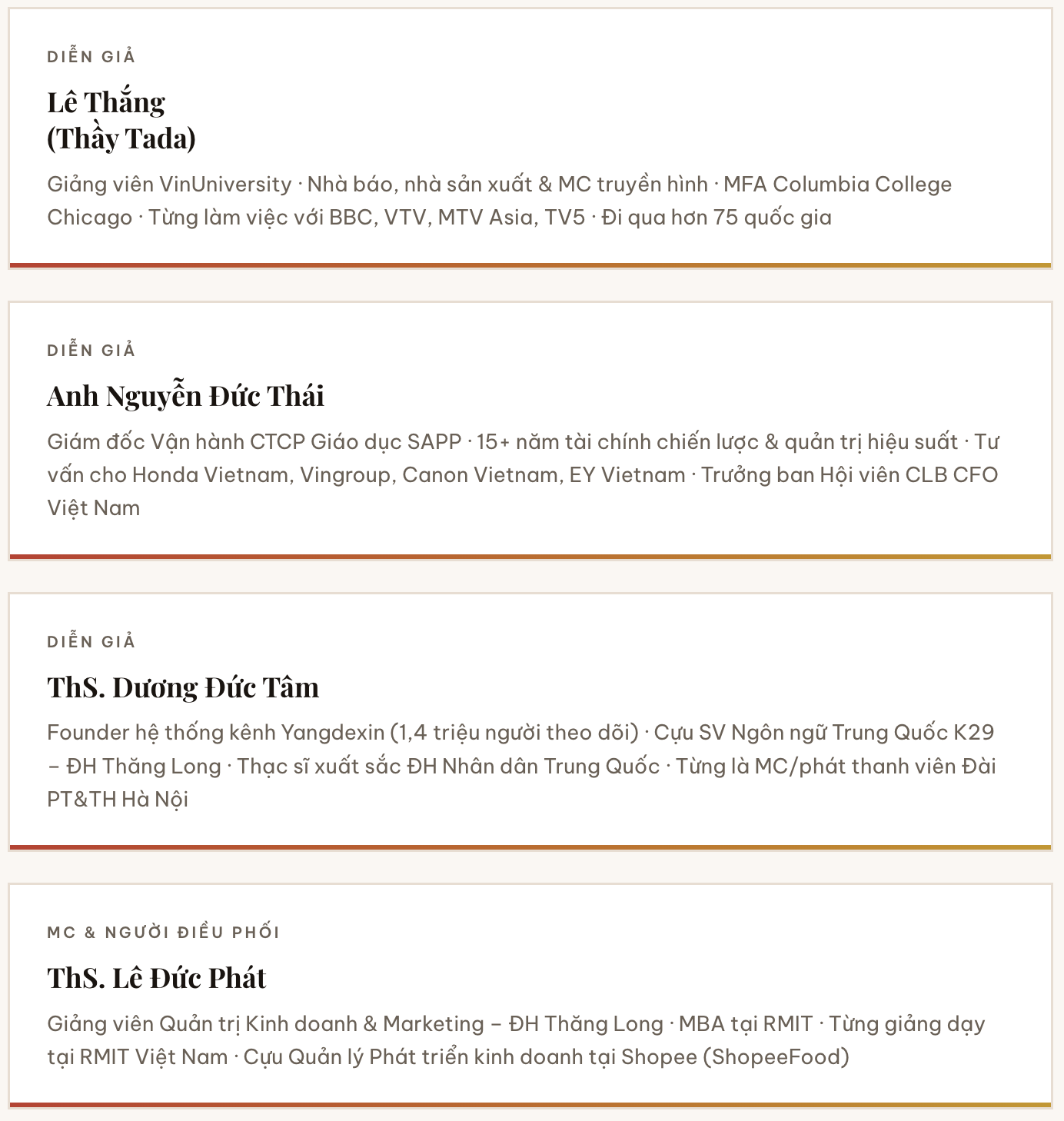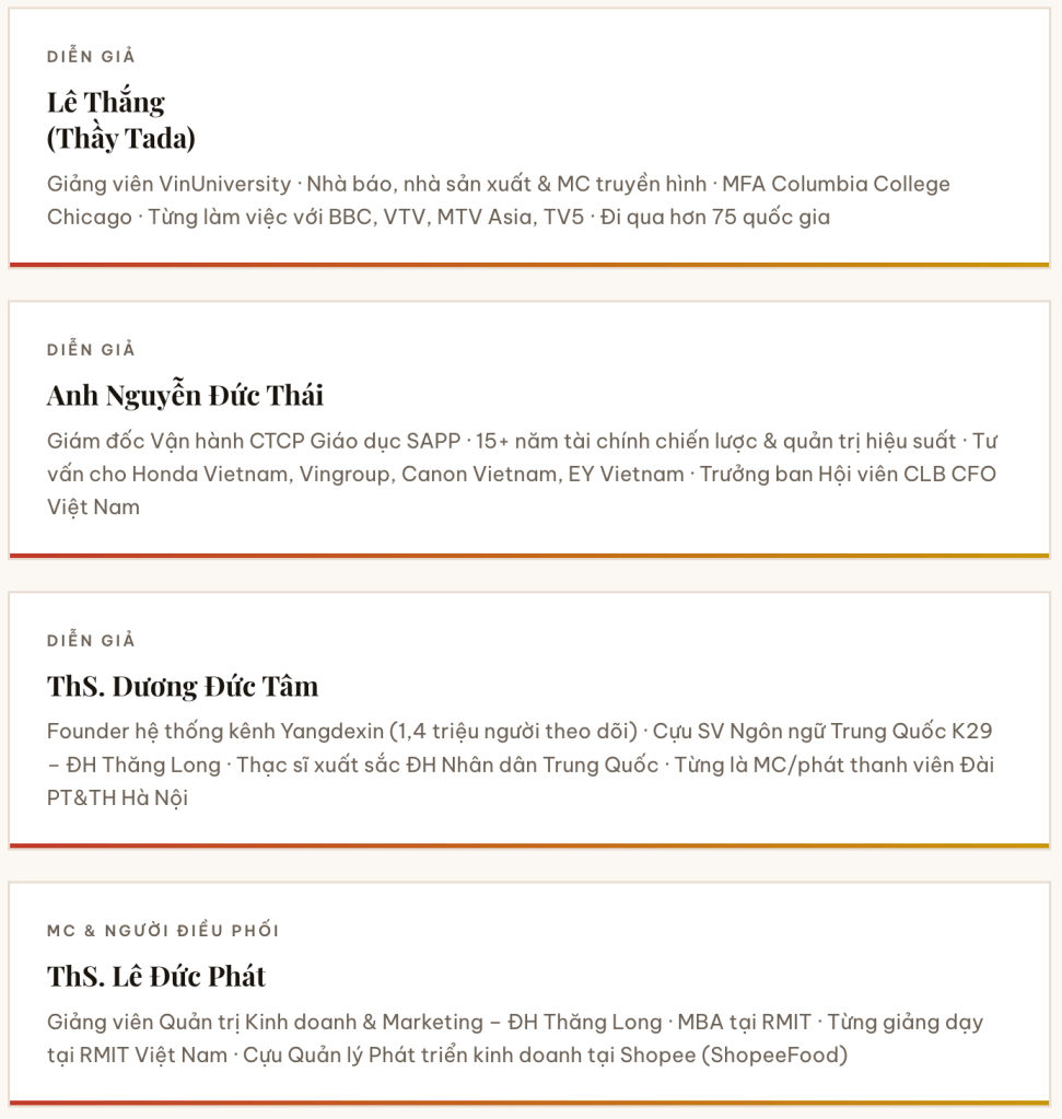 Ba diễn giả đến từ ba thế giới rất khác nhau. Anh Thái mang theo góc nhìn của người làm tài chính chiến lược — tư duy đo lường, hệ thống, hiệu suất. Dương Đức Tâm — một cựu sinh viên của chính ngôi trường tổ chức sự kiện — lại mang đến câu chuyện của người trẻ dám rẽ sang hướng khác: từ MC phát thanh tiếng Trung đến founder một hệ thống kênh hơn 1,4 triệu người theo dõi. Còn tôi xuất phát từ hành trình truyền thông và giáo dục quốc tế — những lần bước vào thế giới mới và phải học lại từ đầu.