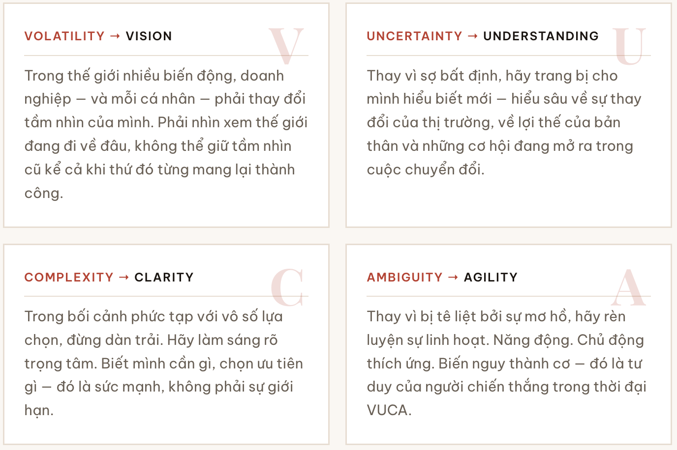 Nhưng tôi muốn thêm một góc nhìn khác mà tôi thấy rất thuyết phục: cách tái định nghĩa VUCA của chuyên gia kinh tế Phạm Chi Lan. Thay vì để VUCA là bốn nỗi lo, bà Lan đề xuất đọc lại nó thành bốn chìa khóa hành động: