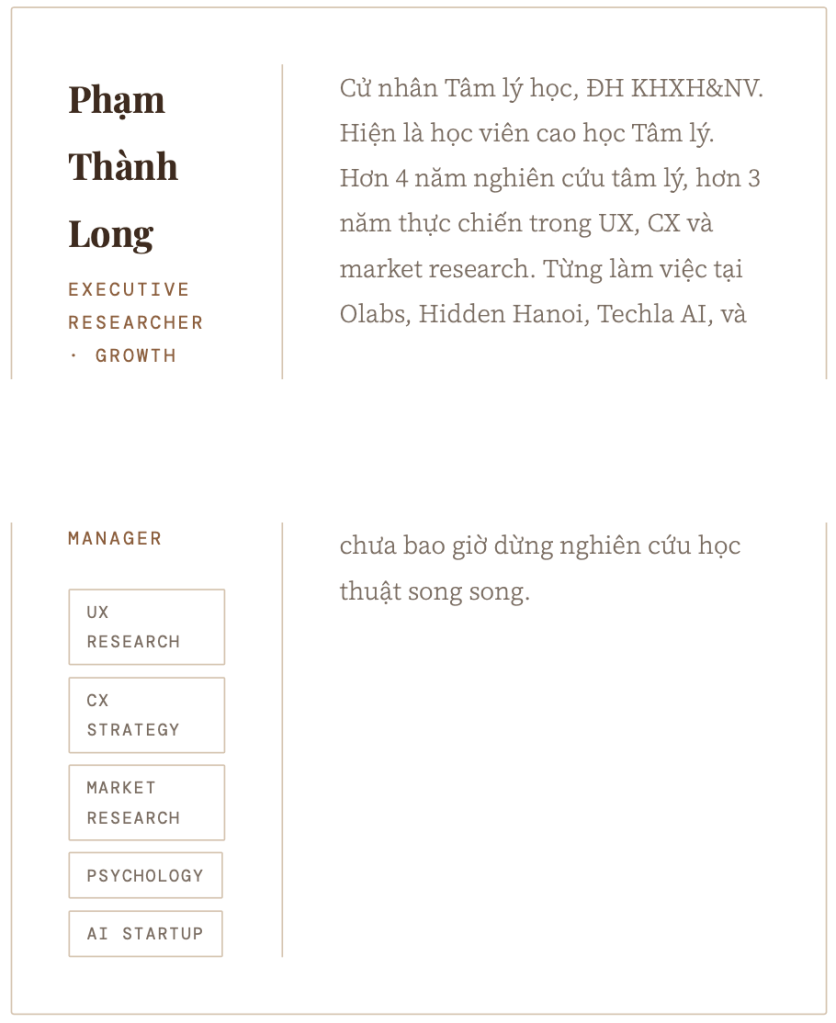 Một trong những câu hỏi tôi đặt ra cho Long hôm đó là: khi anh chuyển từ nghiên cứu học thuật sang làm UX rồi sang strategy, anh phải “bỏ” thứ gì lại? Và thứ gì thật sự đi cùng anh?