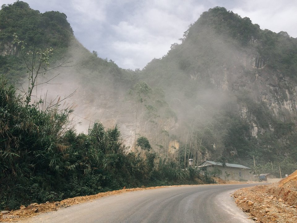 Quốc lộ 4A đoạn qua Cao Bằng quá đẹp và rất dễ khiến lữ khách làm thơ nhưng qua địa phận của Lạng Sơn thì câu chuyện “đã khác”. Chúng tôi được chị bán hàng nước ven đường cảnh báo “sang vùng đất của Lạng Sơn là biết tay nhau ngay em ạ”. Và lời cảnh báo đó quả thực là quá chính xác khi chúng tôi có một ngày trải nghiệm đến tận cùng của cảnh mây mù giữa đường quốc lộ. Suốt cả 30km đường từ xấu đến rất xấu, xấu vì nhấp nhô, lỗ chỗ làm vận tốc xe không ổn định và còn xấu hơn vì đây là tuyến đường giao thương sang cửa khẩu Lạng Sơn nên xe tải và xe container chạy liên tục qua lại làm cả con đường ngập ngụa trong bụi mù trời. Nếu nhìn trên ảnh hay phim ta sẽ thả trí tưởng tượng của mình như sau: Hai bên đường là sương giăng trắng những ruộng ngô tạo nên một phong cảnh rất kỳ thú như giữa mùa đông. Trước mặt là mây! Mây sà xuống mặt đường, lướt qua mặt mình và lởn vởn xung quanh khiến mọi thứ lãng mạn như trong tranh vẽ. Hai cậu bé cứ xuýt xoa không chớp mắt vì khung cảnh ấn tượng đang diễn ra trước mắt. Nhưng thực tế thì không mỡ màng như trong tưởng tượng. Chúng tôi không thể thở, không dám thở dù đã bịt khẩu trang, dù mắt đã được che bằng kính nhưng có cảm giác như bầu không khí xung quanh mình đặc quánh bởi bụi, dày đặc bởi bụi, thứ bụi đá vôi như ở trong xi măng với mức độ độc hại rất cao khiến ta phải rùng mình khi đi qua, khi nghĩ đến. Tầm nhìn của mắt người bị kéo xuống chắc chỉ còn 1m khi ngay trước mắt mình mọi thứ đều mịt mù, hết đoạn đường này đến đoạn đường khác, xe nối xe chạy qua, bụi nối bụi mịt trời. Và nhà cửa hai bên đường thì trắng xoá như trong thần thoại, và cả chúng tôi cũng vậy, lông tay lông chân và lông mày trở nên trắng xoá như các vị thần tiên trong cảnh vật thần thoại hai bên. Đoạn đường qua đèo Bông lau gần như đang đuợc sửa chữ và nâng cấp lại toàn bộ nên tình hình càng khó khăn và bi đát hơn không chỉ cho chúng tôi mà còn cho cả người dân hai bên đường khi phải sống chung với bụi.