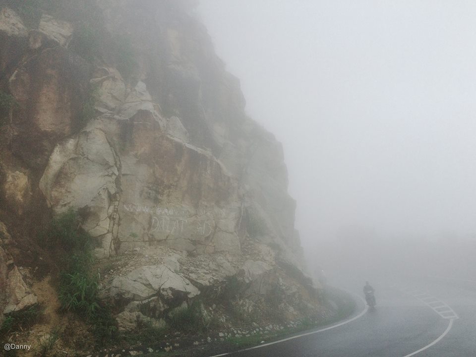 Mọi thứ không được lý tưởng như cảnh vật thiên nhiên mây trời, những giọt mưa đầu tiên bắt đầu nhỏ xuống và mưa nặng hạt hơn. Chúng tôi không còn cách nào khác là phải trú mưa một khoảng thời gian khá lâu trước khi đi tiếp. Chúng tôi quyết định phải lên đường khi trời vẫn còn lâm thâm nhưng đã là mưa núi rồi thì có khi dầm dề cả ngày. Lại quay lại với những con đường đèo dốc, vượt những đoạn dốc cao mờ trong mưa, quanh co ác liệt, suối và thác chảy ầm ầm hai bên đường tràn ra cả mặt đường.