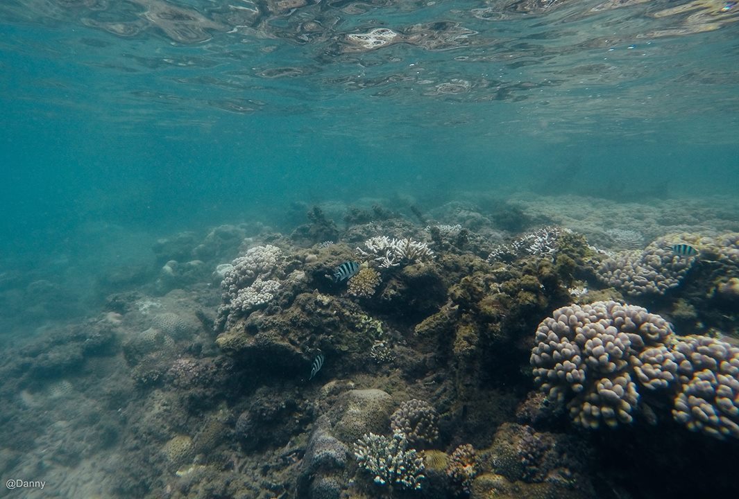 Như đảo cá voi, đảo rùa… tất cả đều mang những hình thù của các con vật, giống một cách kì lạ. Và nói chuyện tên gọi, thì bãi tắm Bà Điên là một bãi tắm có một tên gọi khá kì quái nhưng rất gợi. Vương kể cách đây khá lâu có một gia đình sống trên bãi biển này. Một ngày kia, chồng đi biển mãi không thấy về. Bà ngóng chờ chồng trong nỗi đau tột cùng và hoảng loạn nên đã hóa điên cho đến chết. Nhìn từ xa, bãi tắm Bà Điên lọt thỏm trong những trường lũy đá cao vút, thẳng đứng. Chúng tôi chỉ nhìn thấy một bờ cát trắng chạy dài nhưng đầy quyến rũ. Đây là một bãi tắm khá hoang sơ do cách trở so với các bãi tắm khác nhưng có lẽ chính vì vậy nó mới không bị xâm hại nhiều bởi du lịch. Mục đích của chuyến tàu ra vịnh này là lặn biển, và chúng tôi bắt đầu hành trình của mình để khám phá vẻ đẹp diệu kì của đại dương với rừng san hô ngay dưới chân. Bãi Ông Thịnh nơi chúng tôi ghé chân hiện ra hùng vĩ với cả thảy 307 loài san hô cứng tạo thành một “rừng san hô” nhiều màu sắc phong phú và độc đáo…Thoả thích tung tăng trong làn nước trong xanh, ánh mặt trời chiếu rọi xuống đáy những luồng sáng kì ảo. Quá đẹp và quá khó quên.