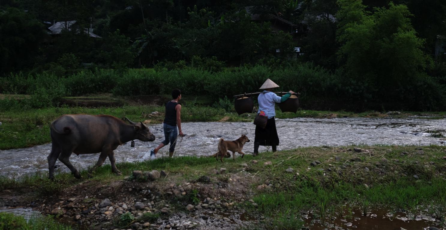 Chiều! Từ ngữ cụt lủn nhưng đoan chắc là vang lên thì gợi rất nhiều. Chiều đi vào văn vào thơ, vào sách, vào nỗi buồn của cô gái lấy chồng xa, niềm khoắc khoải của bà mẹ chờ con, và với riêng cá nhân chúng tôi chiều là thời điểm hợp lại của nhiều khoảnh khắc quý giá, thế nên cậu em “nhiếp ảnh” mới quyết định chọn “chiều” là chủ đề của một dự án nho nhỏ từ dự án Việt nam Việt Nam mà chúng tôi đang thực hiện. Chiều còn có một tên gọi hoa mỹ khác là hoàng hôn, điểm dừng tắt của mặt trời để sang bên kia vòng trái đất, điểm dừng kết của mọi hoạt động ban ngày, điểm hối hả cuối cùng để chuẩn bị bước vào cuộc thảnh thơi của tối. Điểm chuyển giao bao giờ cũng ý nghĩa, nhưng nghe chừng ở chiều thường thì người ta bị tự kỉ ám thị là buồn hơn vui. Cũng có thể nhưng không hoàn toàn chính xác. Ví dụ như buổi chiều nay, trên xã Mường Cang… Chúng tôi đi theo một con đường nhỏ từ thị trấn để vào sâu trong thôn bản, từ trên cao là một đại công trường vàng óng ả màu lúa dưới ánh nắng chiều dần tắt. Một con suối vắt vẻo bé bé chạy qua những cánh đồng này là một thứ rất kích thích, kích thích đến điên cuồng. Nó dẫn chúng tôi đi sâu xuống bằng một con đường bê tông bé xíu, ngoằn ngoèo, rất dốc và nhiều ngã rẽ. Điểm cuối cùng của con đường là một dòng suối bắc ngang qua mà người dân gọi là bãi đá. Bãi đá chứng kiến những khung cảnh yên bình bậc nhất của ngày, hối hả bậc nhất của ngày và cũng nên thơ bậc nhất của một ngày. Hãy nhìn vịt trở về chuồng, trâu tắm táp để về nhà, những bó lúa được nhanh tay xếp lại, chú nghé con ngơ ngác gọi mẹ cho về. Và ở xa xa, màu khói xám của bếp bắt đầu nghi ngút lên từ một liếp nhà, rồi nhiều liếp nhà như một hiệu ứng dây chuyền: Chiều!
